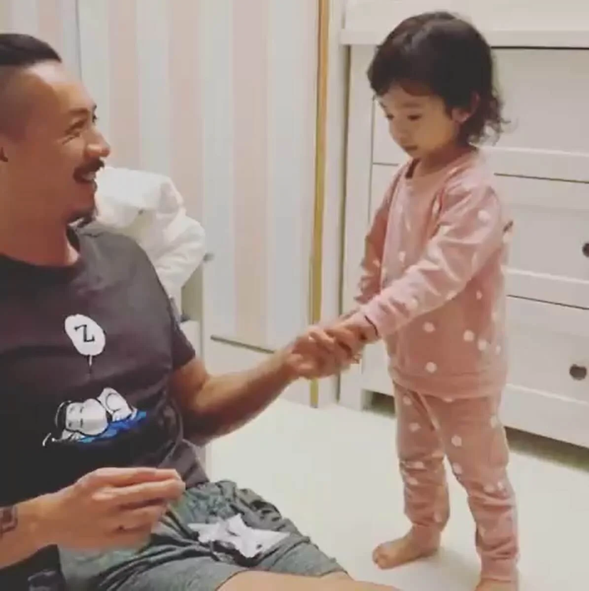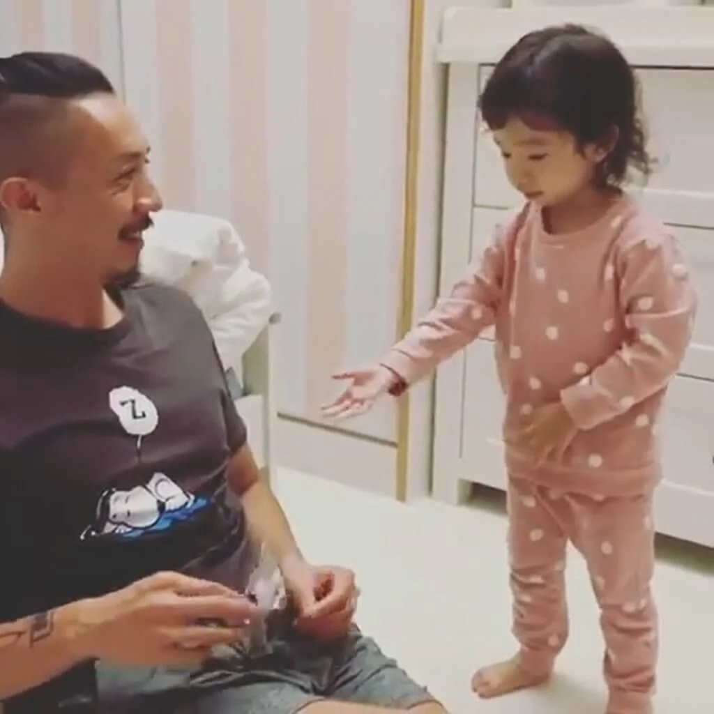 張繼聰很疼愛4歲女兒張靖,不過偶爾也喜歡作弄她,阿聰今日(23/09)於IG分享一段舊片,回味女兒的可愛事,只見他手中拿着朱古力,張靖走到爸爸身旁想要索取時,阿聰說道:「hand hand。」張靖乖乖地伸出手來,卻未有如願地得到朱古力,遭爸爸整蠱,要使出冧功才得到朱古力。