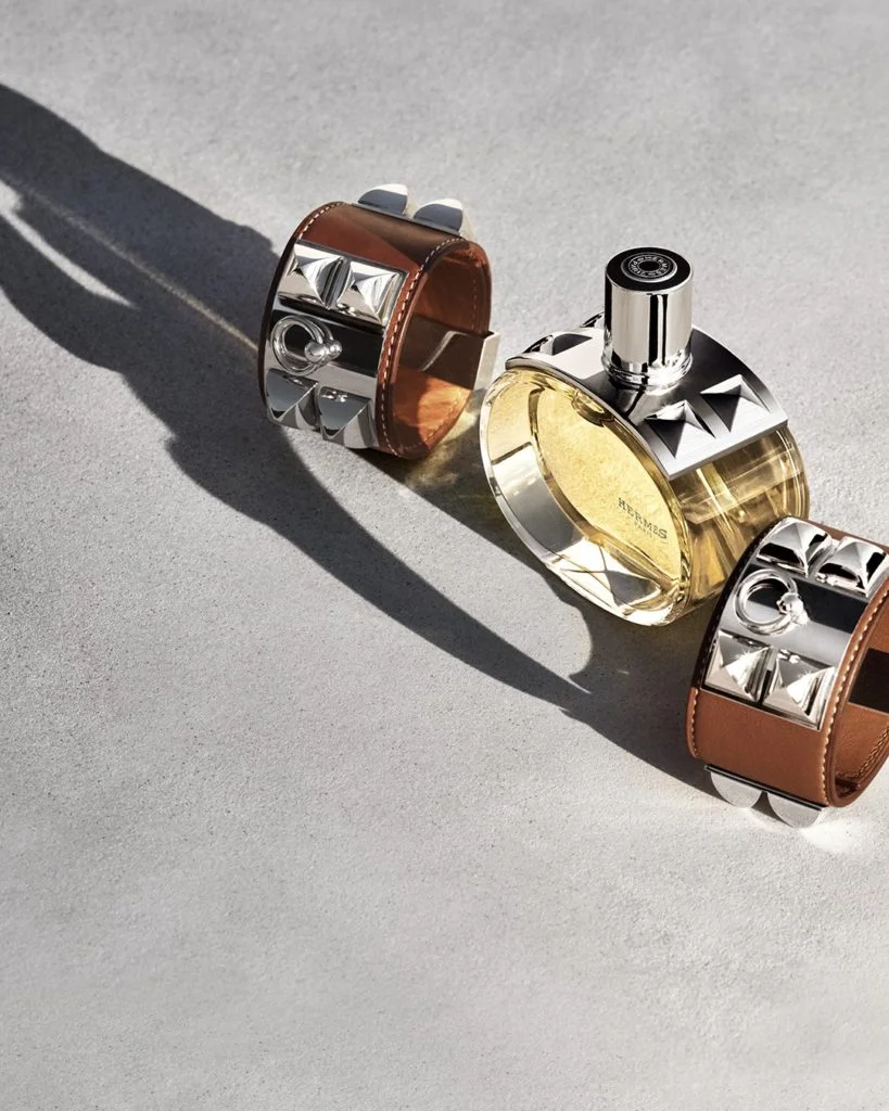 從經典手環Collier de chien中獲得靈感的香水瓶中,裝着的是Hermès愛馬仕首款 chypre(柑苔)香調的作品Barenia,品牌香水創意與傳承總監Christine Nagel從Barénia馬鞍皮獲得靈感,以蝴蝶百合、神秘果交織起來,再加入橡木的溫暖氣息和廣藿香的深邃韻味,幾種反差鮮明的嗅覺元素,與肌膚交融之後顯露芬芳, 留下難以忘懷的記憶。