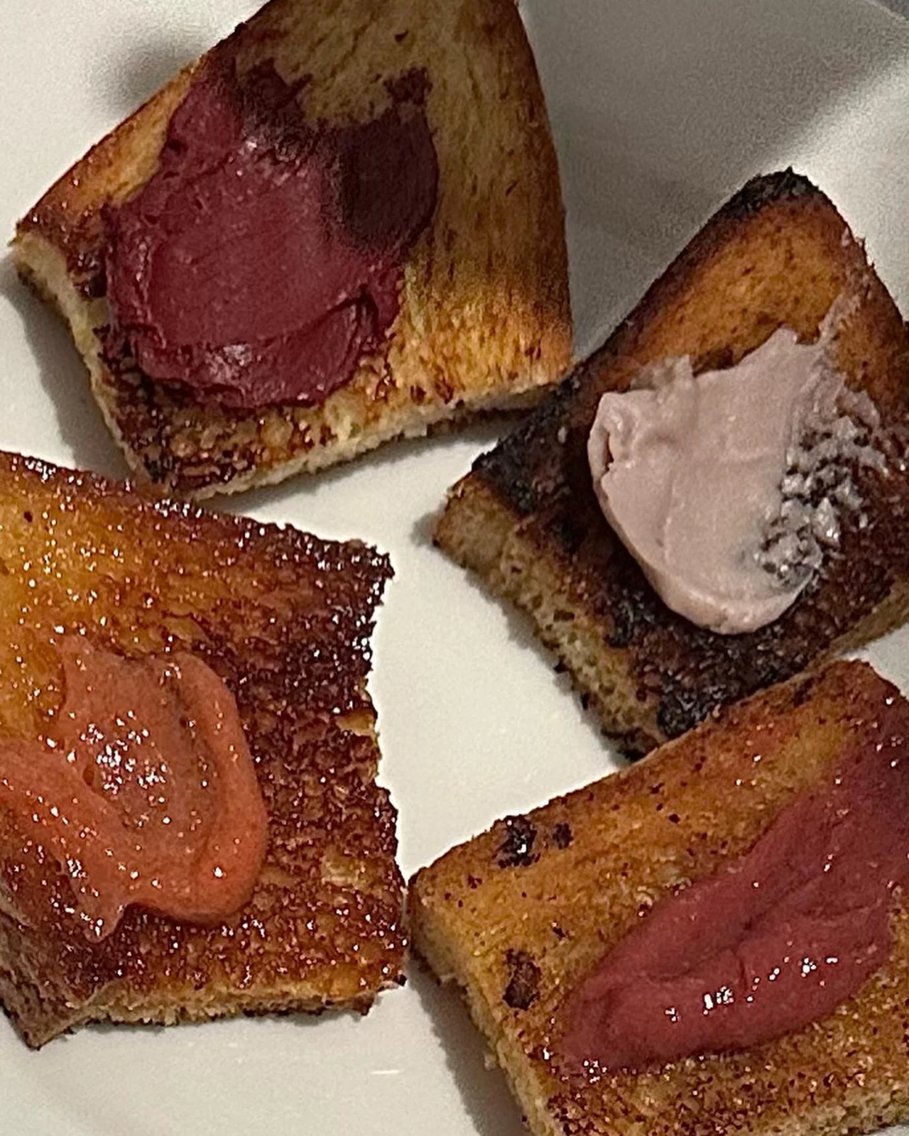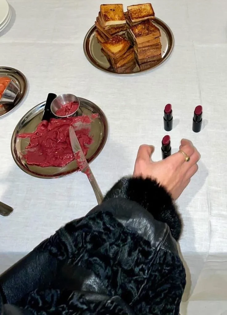 時裝與時妝密不可分,Alina認為《Fashion Diaries》的發布會上若添加美妝元素,更可實踐時尚一詞。為甚麼不是其他化妝品?「唇膏除了代表法式風情,亦是所有美妝品中最接近食物的,因為塗在嘴巴上。」唇膏有四種色調,皆以天然食材製作-酒紅色:紅菜頭與黑朱古力;粉紅色:覆盆子與黑胡椒;豆沙色:洛神花;橙色:木梨果醬。「一開始很多人以為這只是化妝區。當他們看到有人吃唇膏時,大吃了一驚。」雖然平日化唇妝後也吃過不少,但真的主動咬下去時還真新鮮。「我亦做了法式吐司,他們塗了唇膏後吃,法式吐司變得更加『法式』。」