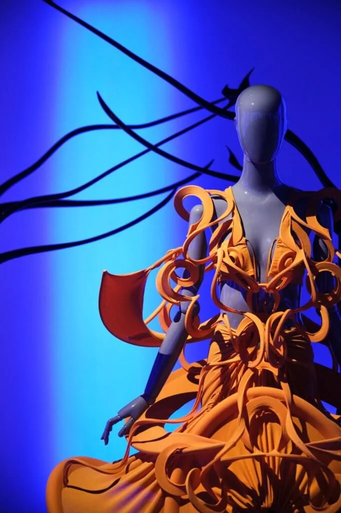 除了將以往作品展出外,龍之祐更為這次展覽打造一套全新的Couture。「全新創作的橙 色連衣裙靈感來自於這次展品中設計師 Paul Poiret 的 SAMOVAR EVENING DRESS ,整件展品的輪廓簡而有力,鍍金金屬線編織而 成的部分和無比精緻的裝飾皆激發我的想像力,爆發更多的靈感和創意。所以作品上我以刺繡作畫龍點睛之處,加入立體和平面的設計元素,雖然與Paul Poiret 的設計方式不同,但創作的意念和精神卻是相同。」