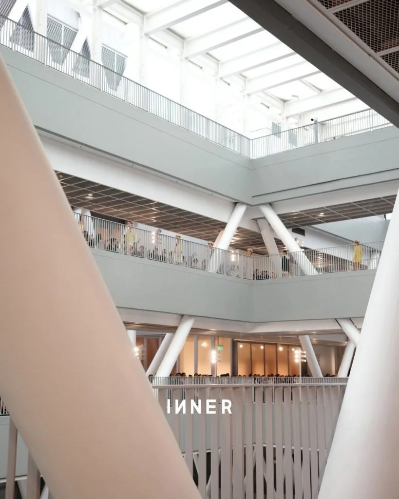 到底在HKDI可以怎樣搞show?T台又怎樣搭建?相信這是很多人心𥚃的問題。這次品牌沿用建築物本身的設計,不額外多加陳設,把課室的窗打成夕陽西下的橙色,讓模特兒於七、八樓的空中平台走秀,泰國模特兒兼《出貓特攻隊》演員Aokbab Chutimon 也專程到來,一身全白造型走秀。