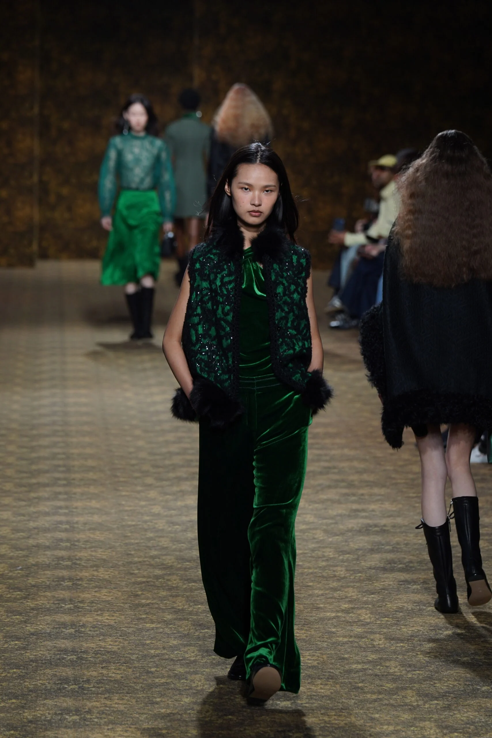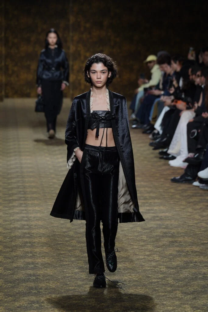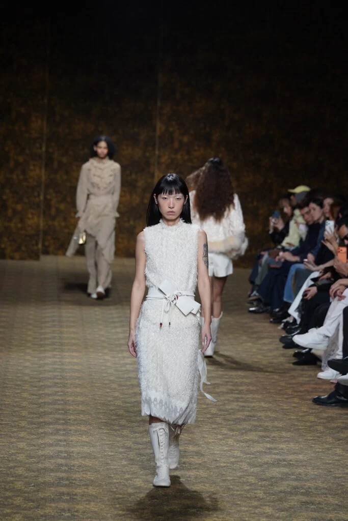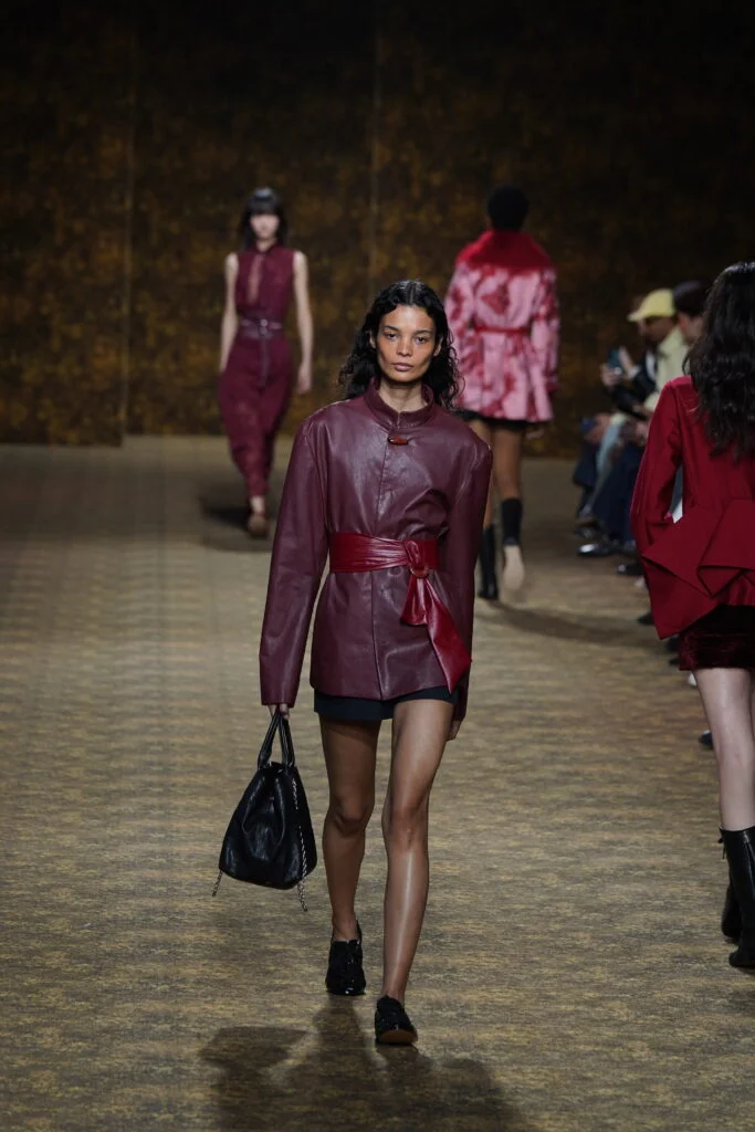「玉」作為本季的精神符碼,配件同樣延續玉的圓融精神,平安扣、玉珠、玉鐲等圓形意象象徵圓滿與守護,項鍊更可轉換成別針,佩戴方式靈活多變。全新手袋款式包括:玉鐲輪廓的長型袋、玉提把化妝袋與溫潤毛海元寶袋,以金龜子綠、紅、白為主色,搭配山水圖案與手工釘繡。鞋款則取材唐代扁底鞋結構,涵蓋平底、球鞋至纏帶跟鞋,將古典比例融入當代穿搭。