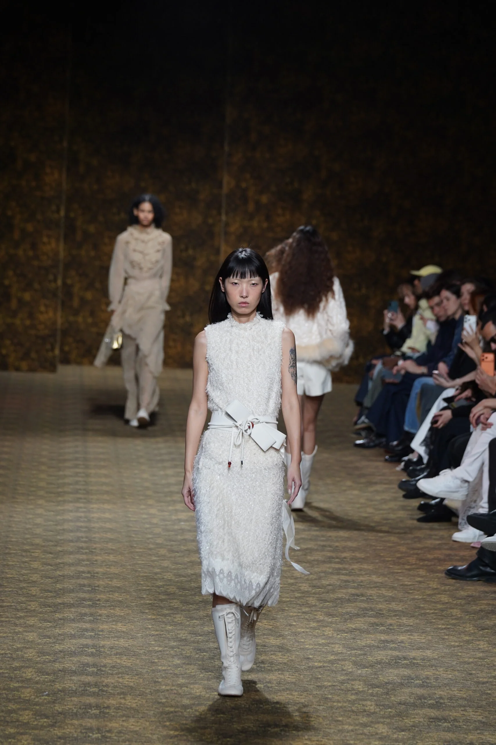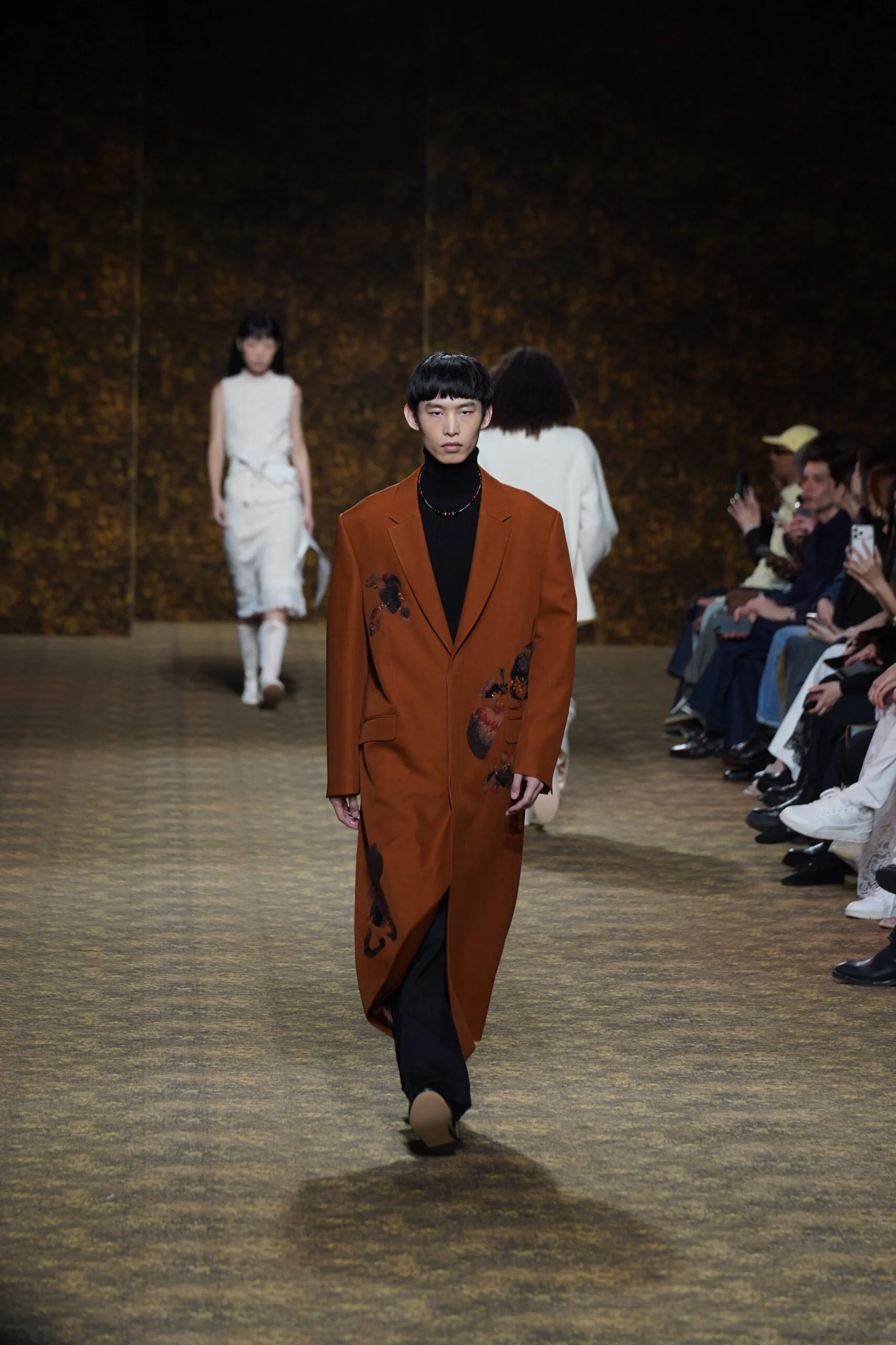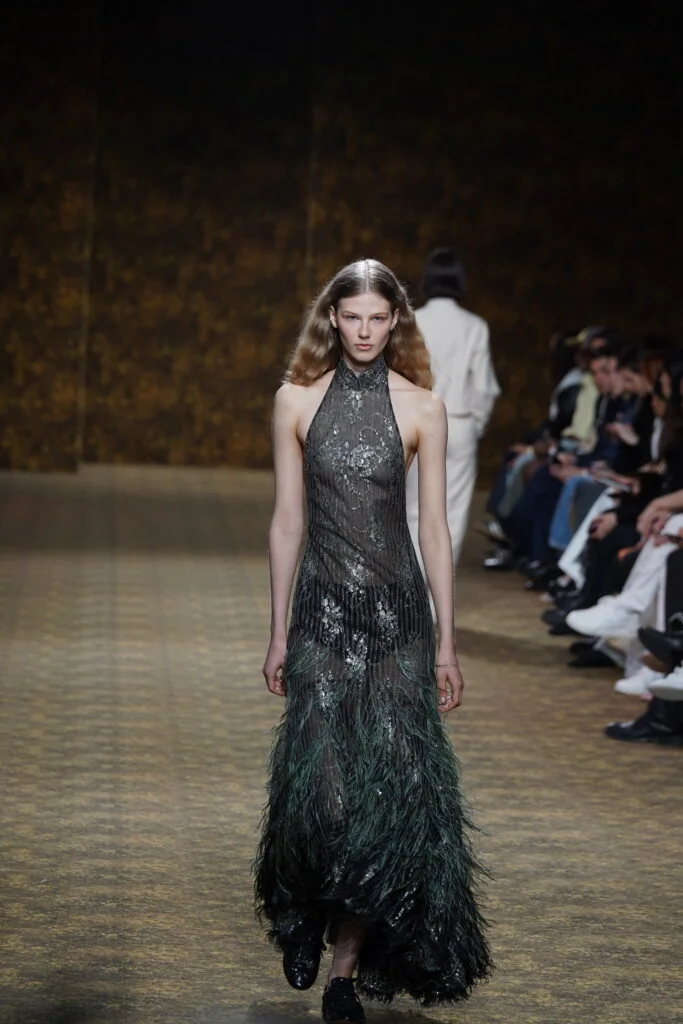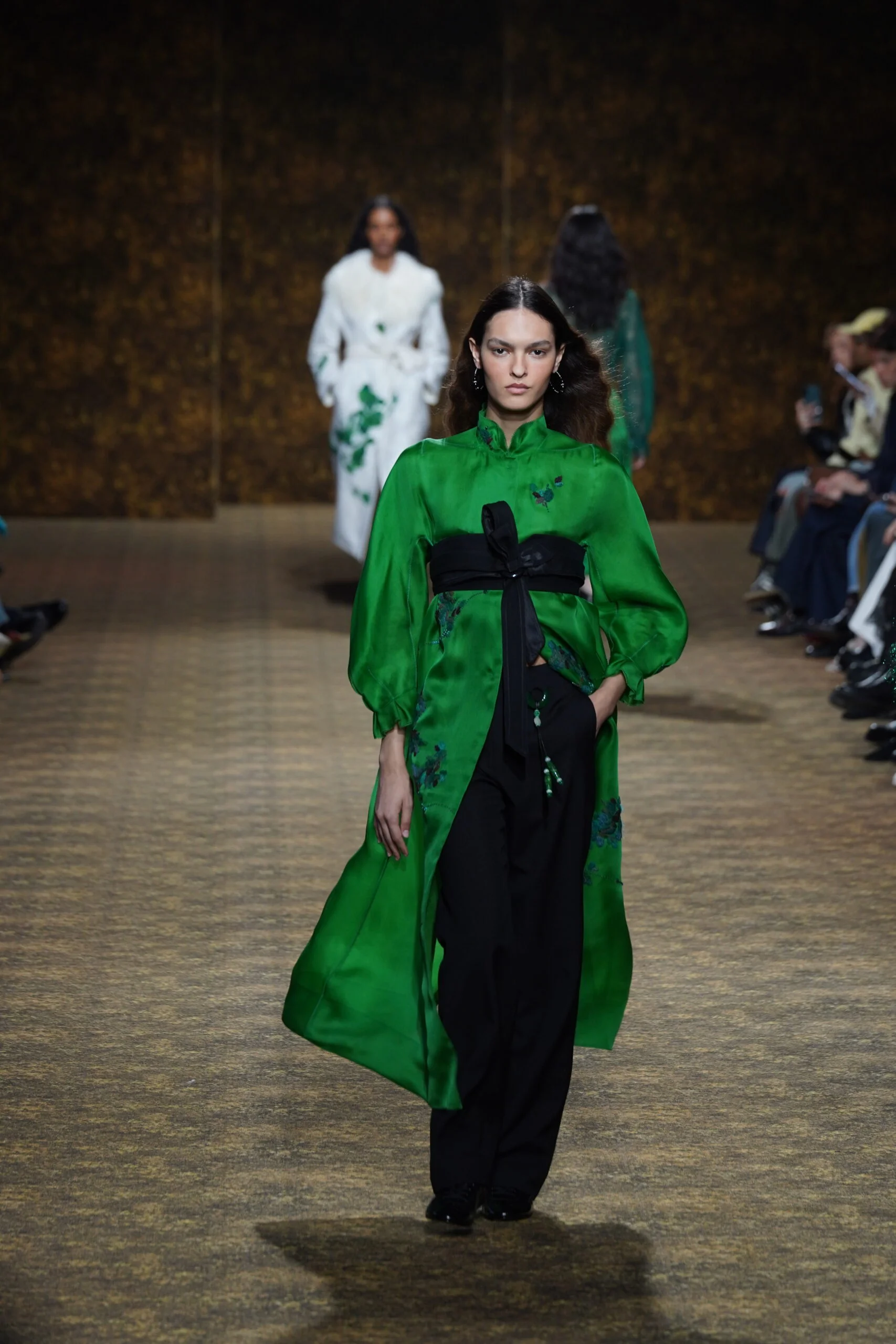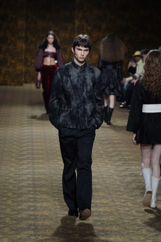 INNER身在巴黎直擊 Shiatzy Chen FW2026系列 ——《舞玉》。整體以盛唐為靈感,將「玉」的溫潤與「舞」的流動融入男女裝設計。女裝以唐代高腰、腰封、飄逸襦裙為輪廓,勾勒線條,搭配唐三彩的橘、綠及金色為核心色調,增加層次感。男裝則以陰刻刺繡、仿舊布料、西裝腰封、方形連袖與中式鑲邊口袋,打造剛柔內斂的氣場。