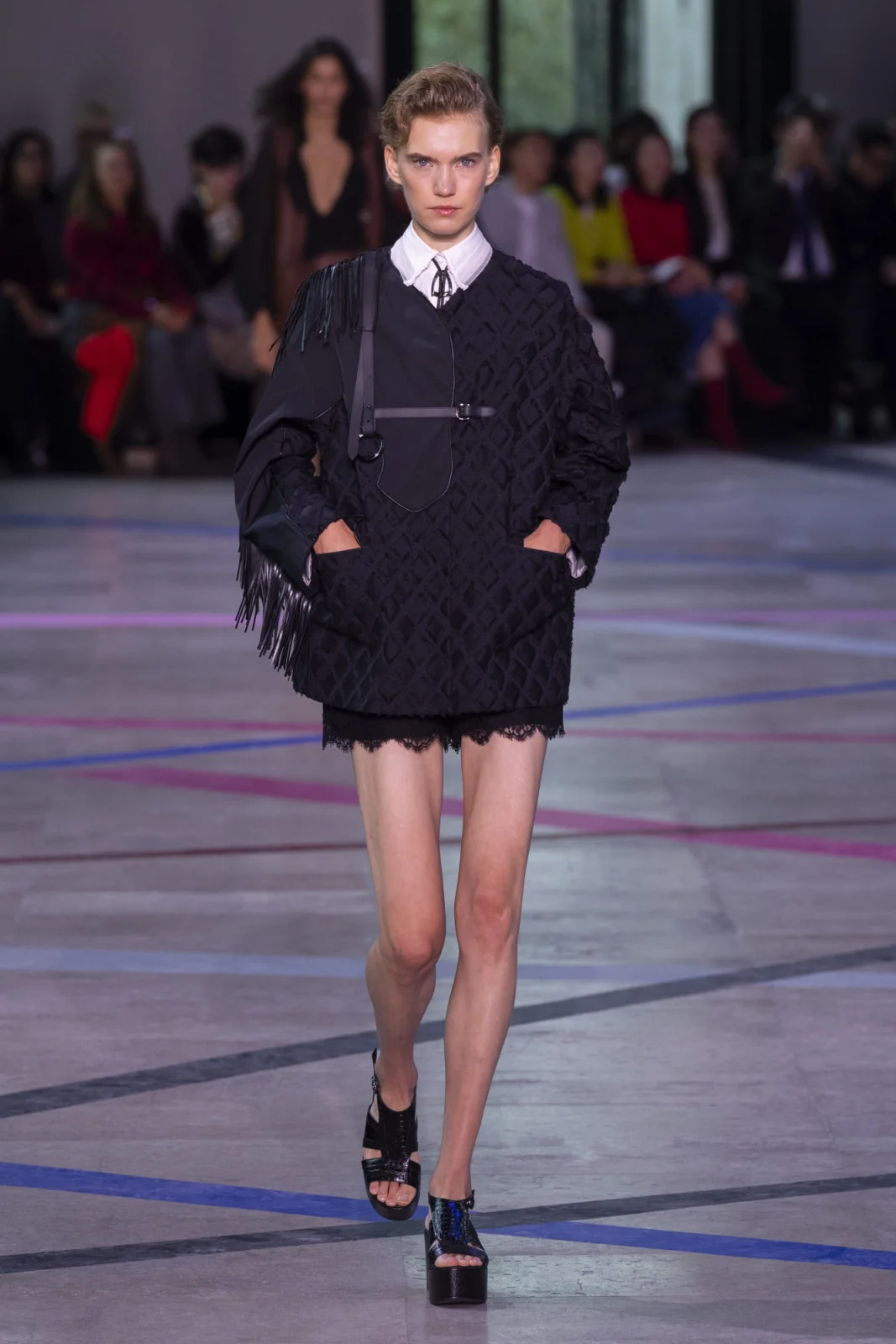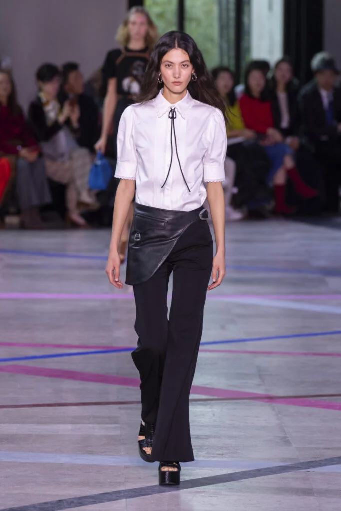 Shiatzy Chen以東方成語「馬不停蹄」為設計辭彙,將馬的優雅、速度與一九七○年代嬉皮精神相融,打造「東方嬉皮」風格。馬術元素暗藏於細節:馬鞍的圓弧線條化作口袋結構與包型輪廓,馬銜與馬蹄鐵幻化為耳環、領針與鞋履扣件,金屬掛扣與層疊結構呼應馬具的實用美學。色彩上,煙草棕、咖啡色呼應馬具質感,亮玫紅、鈷藍增添活力。輪廓以「長加長」為核心,大喇叭褲搭配雪紗上衣,軟料套裝呈現鬆弛卻挺拔的姿態。