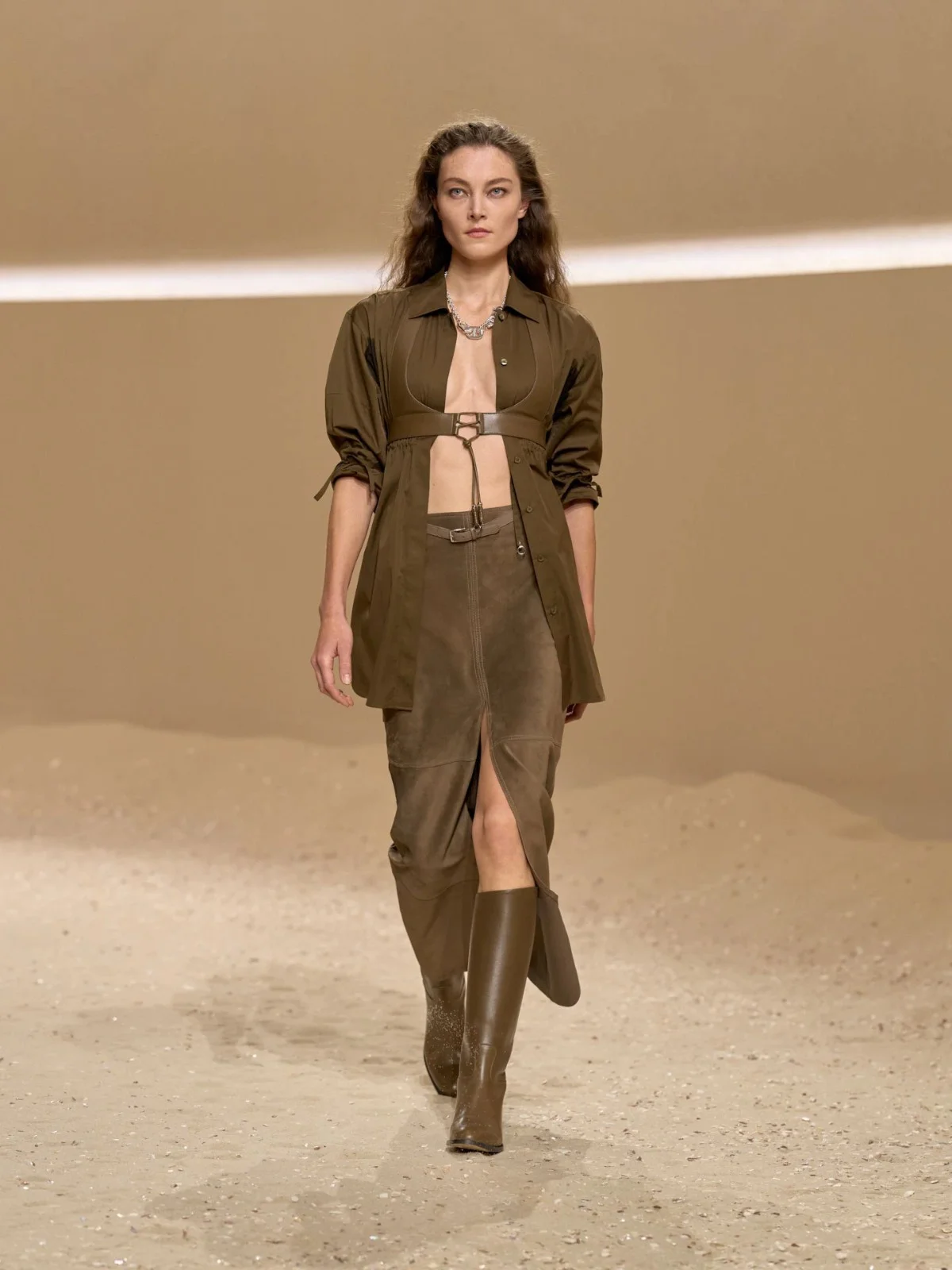 Hermès二○二六春夏系列以”Free Rein”為核心,將法國南部卡馬格地區的馬術文化作設計藍圖。品牌典藏館的古老馬鞍是靈感來源,轉化為短版馬術外套的利落肩線與不對稱亞麻裙,詮釋馬術美學。馬具式腰帶勾勒腰線,延續馬場的功能性與力量感;風衣式長外套則隨步伐輕擺,暗藏騎乘時的動態平衡哲學。