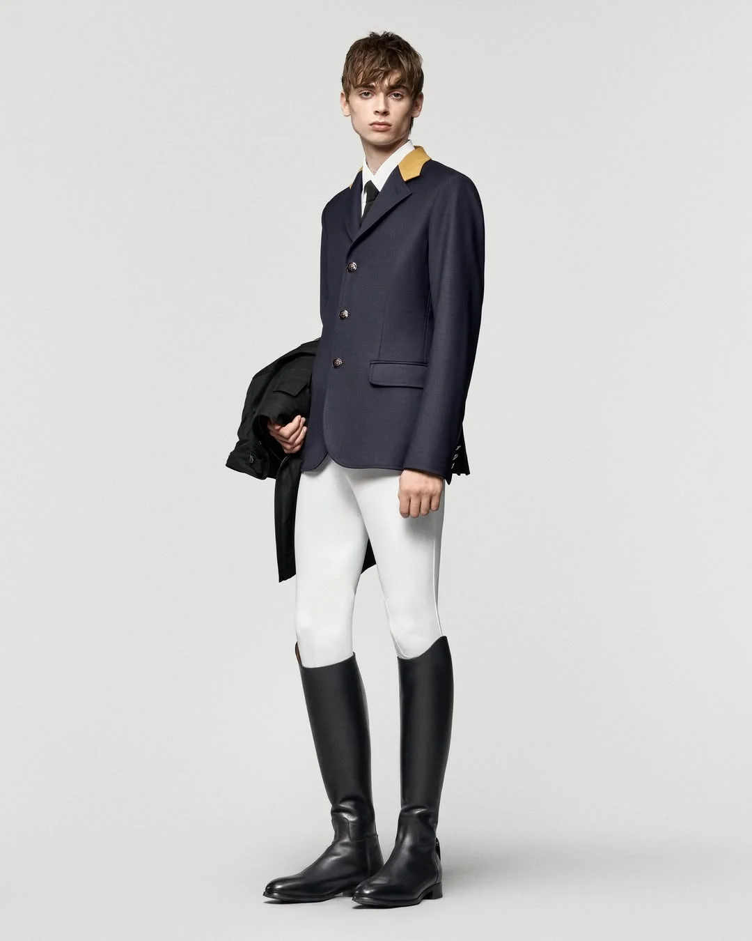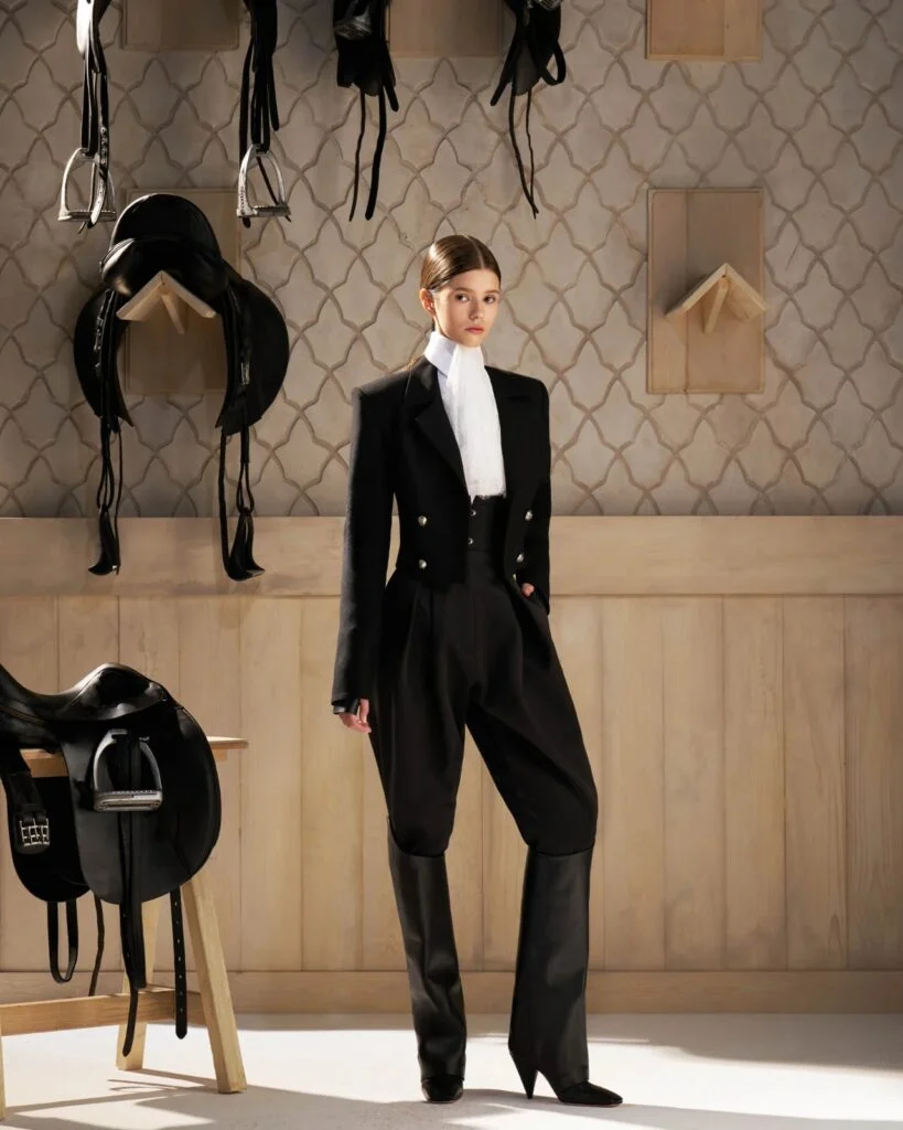 二十世紀,馬褲開始變得流行。這種源自印度、臀部寬大、膝至腳踝緊身的褲裝,隨馬球運動傳入歐洲後迅速風靡,在彈性面料發明前極大提升了騎行靈活性。女性徹底擺脫裙裝束縛,馬術服的面料與剪裁持續革新,防水、耐磨材質廣泛應用,更契合人體工學。與此同時,馬帽、及膝長靴等馬術元素跨界高級時裝,成為設計師汲取靈感的源泉,實現了從專業裝備跨越到時尚舞台。