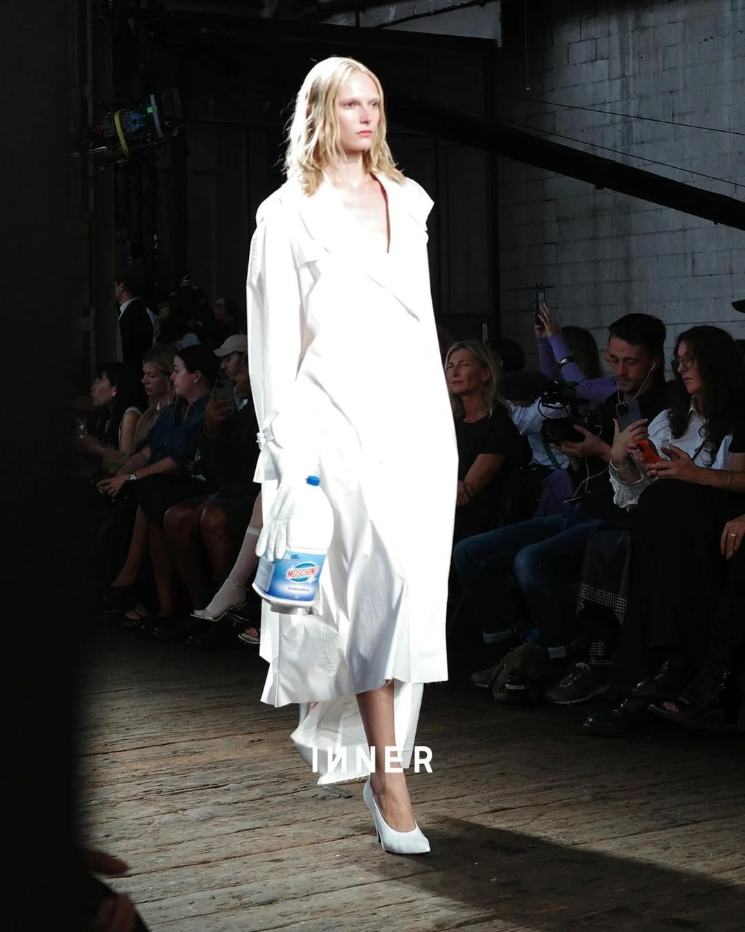 Moschino一貫其搞怪的作風,Adrian Appiolaza為觀眾帶來滿滿的驚喜:模特兒手拿著茶煲、Moschino牌的清潔劑、經典的黑色Tubino連衣裙與印花絲綢家居服融為一體,室內裝飾變成了奢華的外套,鞋帶堆積成大衣,然後模特兒像我們小時候一樣,把床單披上身,當成華麗的衣裳。