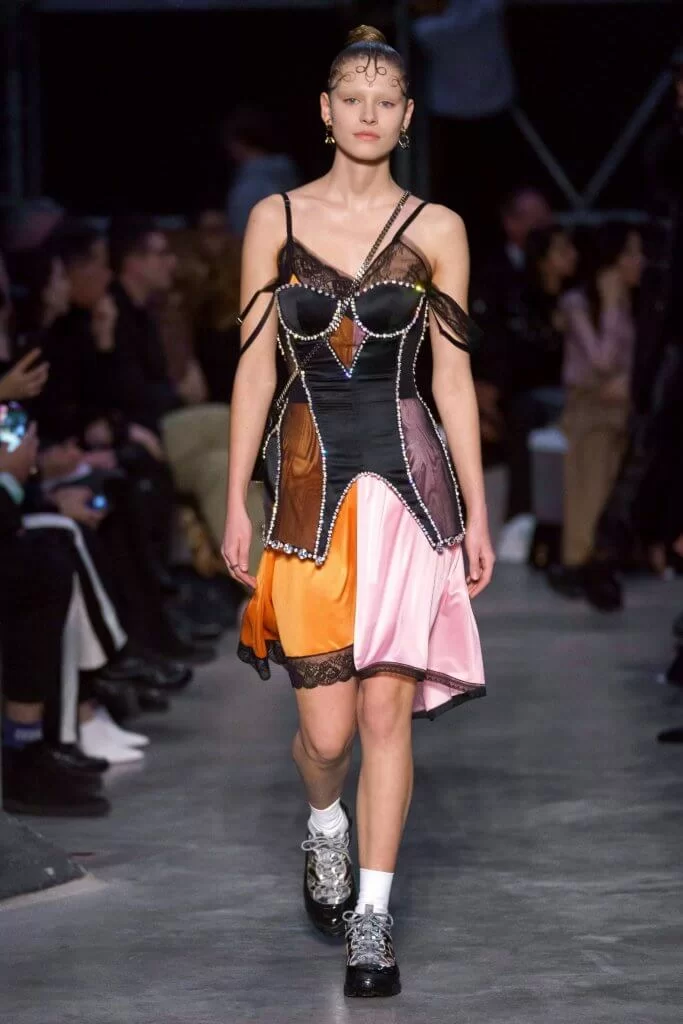 Riccardo Tisci將這場騷命名為“Tempest”(暴風雨),一場英國文化與氣候的對比,帶來超過100個造型。開場十幾套無疑是面向年輕一代的口味,以及他本人一如既往對於街頭風格的熱衷,而經典的Burberry格紋在微調了色調和拼貼後,不再是上一代獨有的產物。來到中段,機能性羽絨和禦寒大衣頻繁出現,男士都揹上了女性化的鐵鏈小袋,以及各種出其不意的混搭。時裝騷的後段是一場社會菁英的強大陣容,大量採用奢華面料的西裝和駝色套裝,去年全新創造的monogram也點綴在不同的單品上。