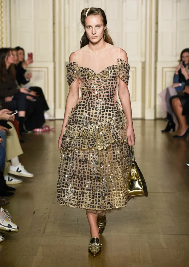 今次在2019秋冬系列中,亦不例外將衣服化為語言,主題為「親密、私人、安全感、女性」。在Simone而言身體與衣服有所連繫,內衣是女性,衣服是男性,內衣保護着衣服,兩者又有着不能或缺和密不可分的關係。See-through、薄紗和花是Simone Rocha常見的元素,今季較注目的是珠片、閃石。一件薄紗長裙外襯滿佈閃石的bra top、粉紅色珠片長裙、see through乾濕褸、立體花朵套裝;配上剪裁較陽剛粗獷味的宮廷泡泡袖和泡泡大裙襬,比喻即使單薄小巧的內衣是保諼罩也能給予人安全感。