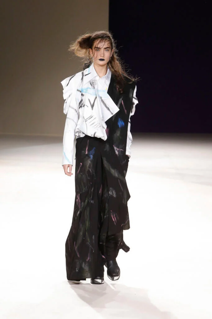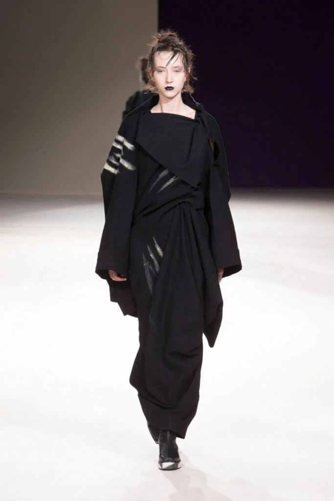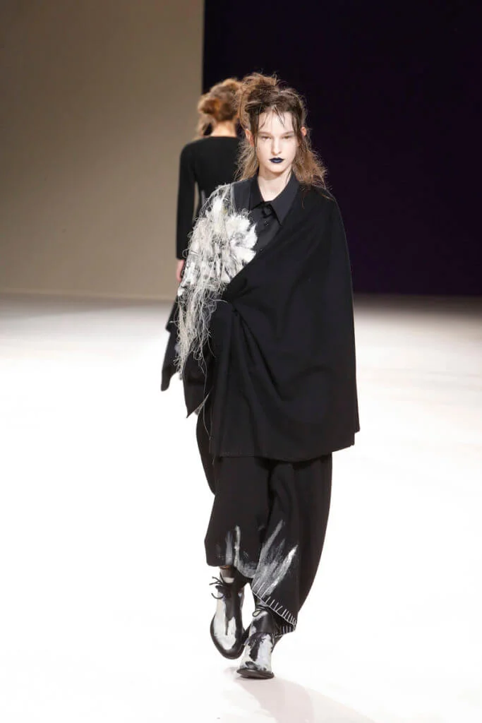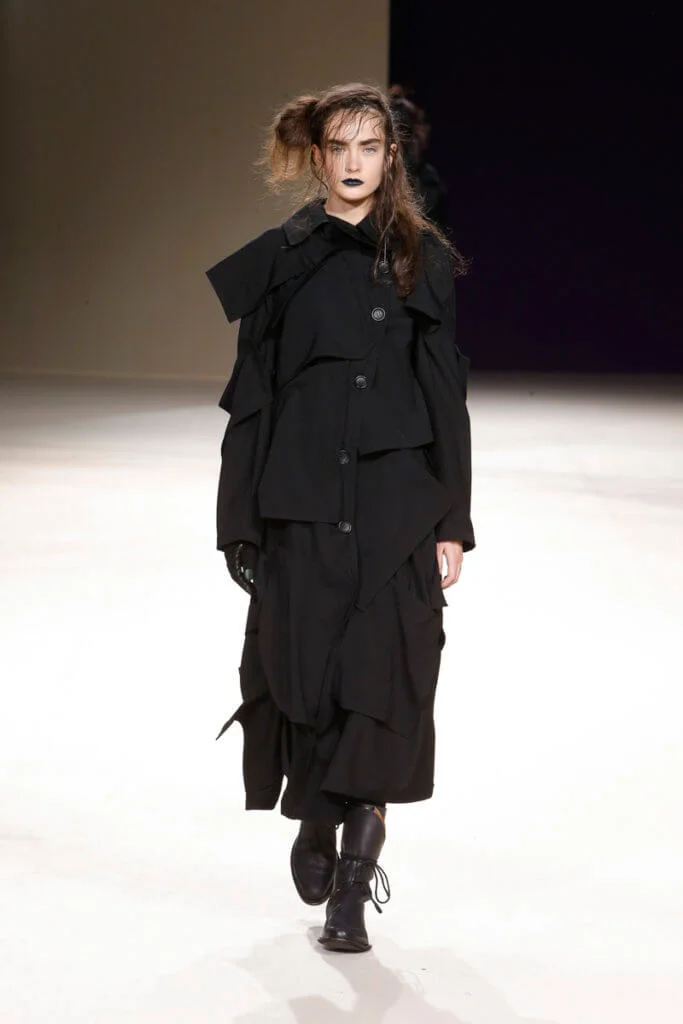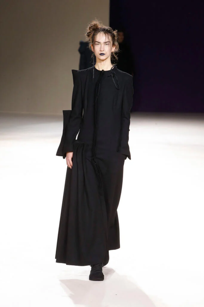 現今的時裝界變化急速、繽紛絢爛,Yohji Yamamoto十年如一日的不變反而難得又耐看。山本耀司直言這個FW19系列是他對現今時裝世界的回應:「我像個小女孩,造衣服是如此好玩,我在享受當中的過程,而不是一個時裝大師。」他回到了最初,當造衣服還是用雙手DIY的日子,所以這個系列在一貫的黑調和垂墜感中不乏拖尾的鬆散線頭、胡亂手畫的繪圖、自然隨意的刺繡等細節,藉此表現時裝原本的純粹。然而來到今日,衣服本身的設計已不再重要,嘩眾取寵引起話題才是大勢。山本耀司不否認,當中一套絨裙大褸中拼接了舉中指的手套,是對時裝界的控訴,也只有如他這般的時裝大師才有這樣的能耐,在時裝洪流中仍然堅持做自己。