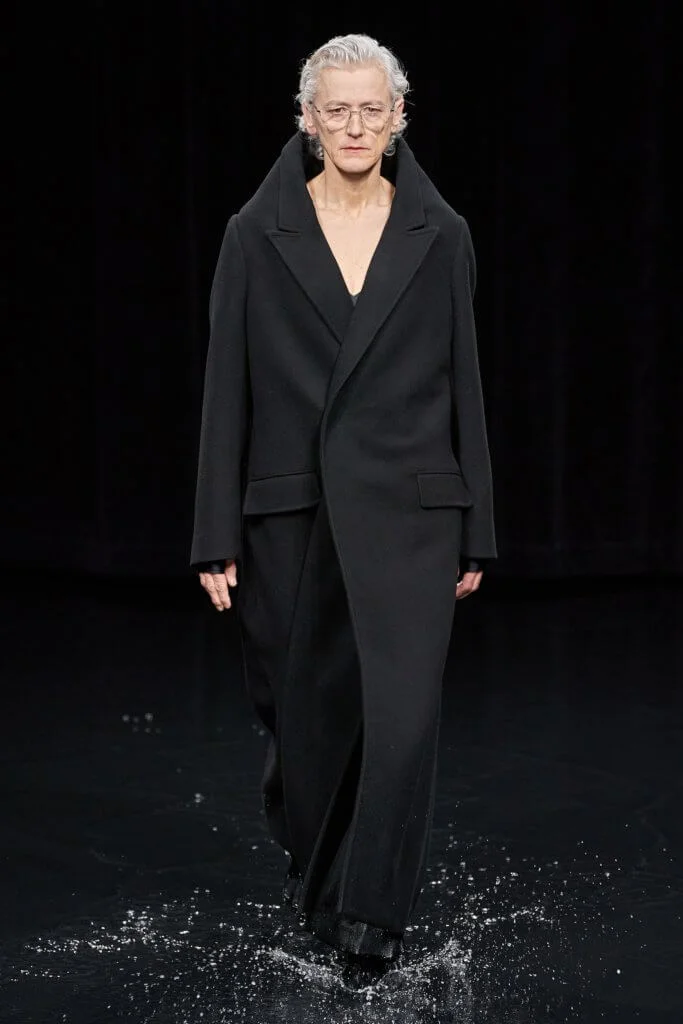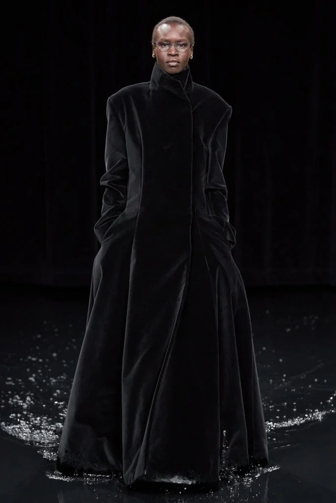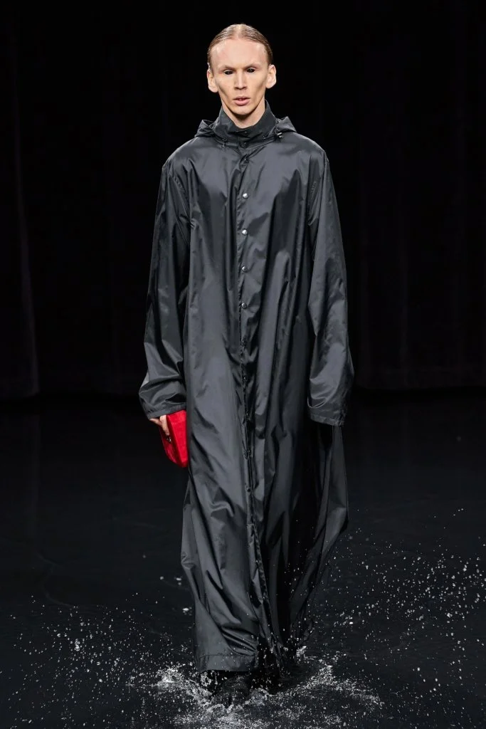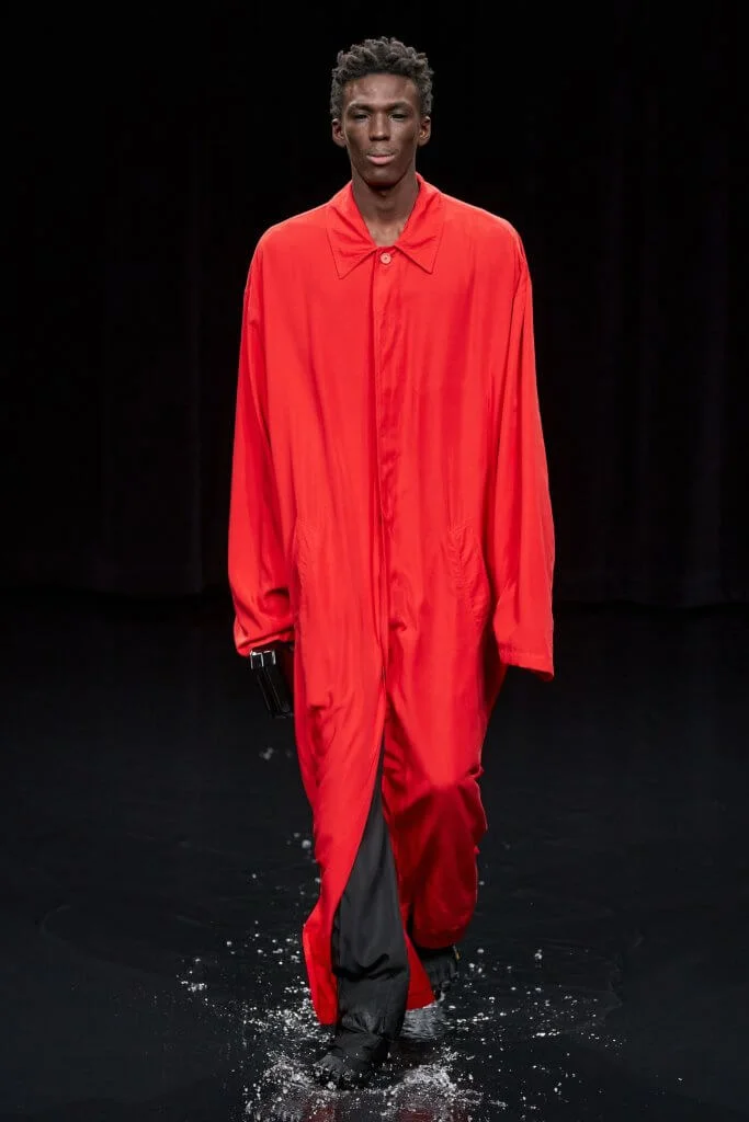 創意總監Demna Gvasalia近幾季擺脫高調的誇張,但噱頭依舊,勝在主題、佈置、配樂統統細緻起來。御用製作團隊la Mode en Images將秀場化成汪洋,前三排的座椅都被淹沒(沒有了所謂的front row),頂部的巨大屏幕伴隨著光影轉換,海洋、雷電、烏雲、晚霞、晨曦等各個場景交替出現,締造驚心動魄的視覺衝擊。整個系列仍然是Demna主打的吊詭式哥德風格,模特兒削骨般的妝容配搭方形和蠶形輪廓的服裝,在莊嚴中把剛強與力量融為一體。