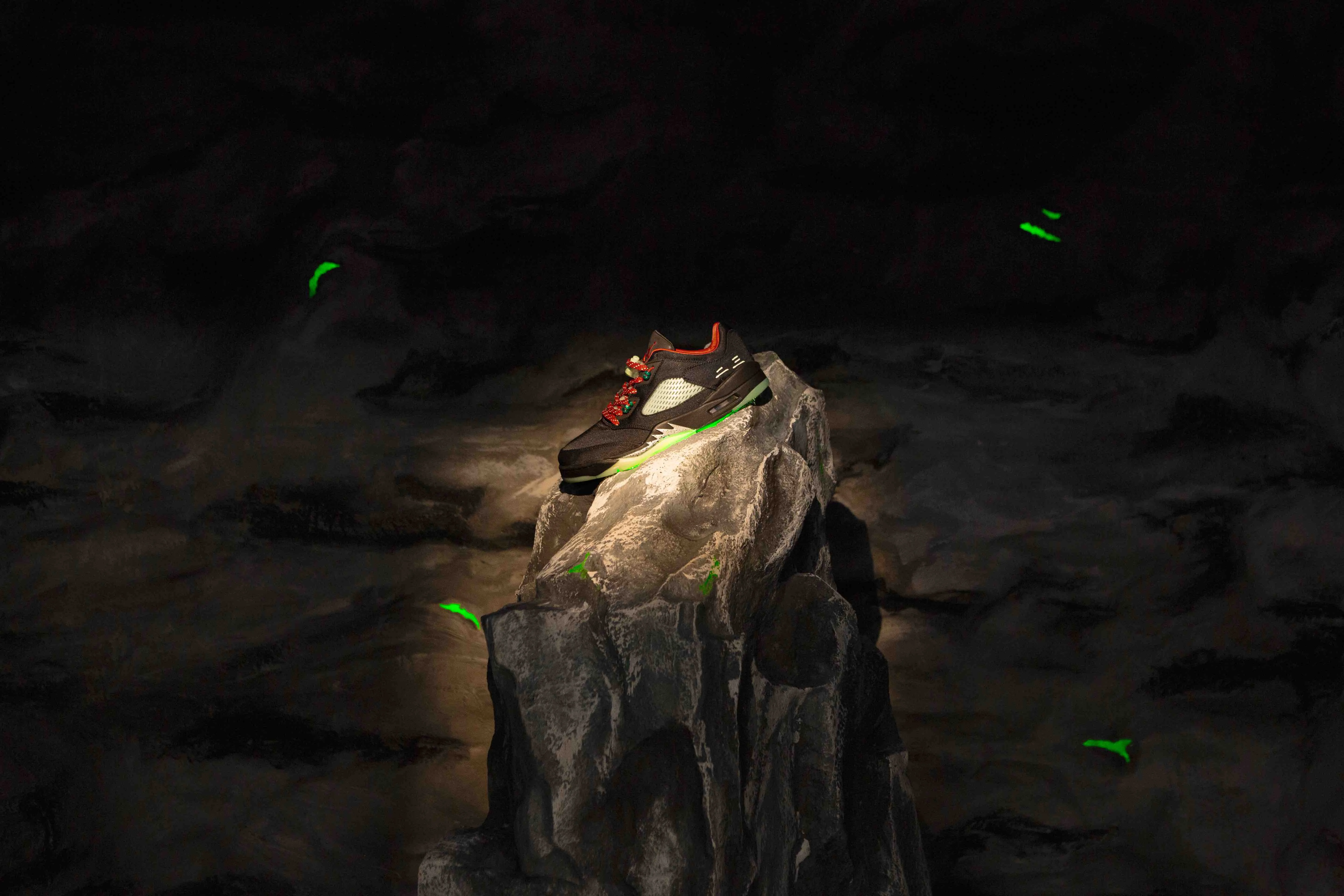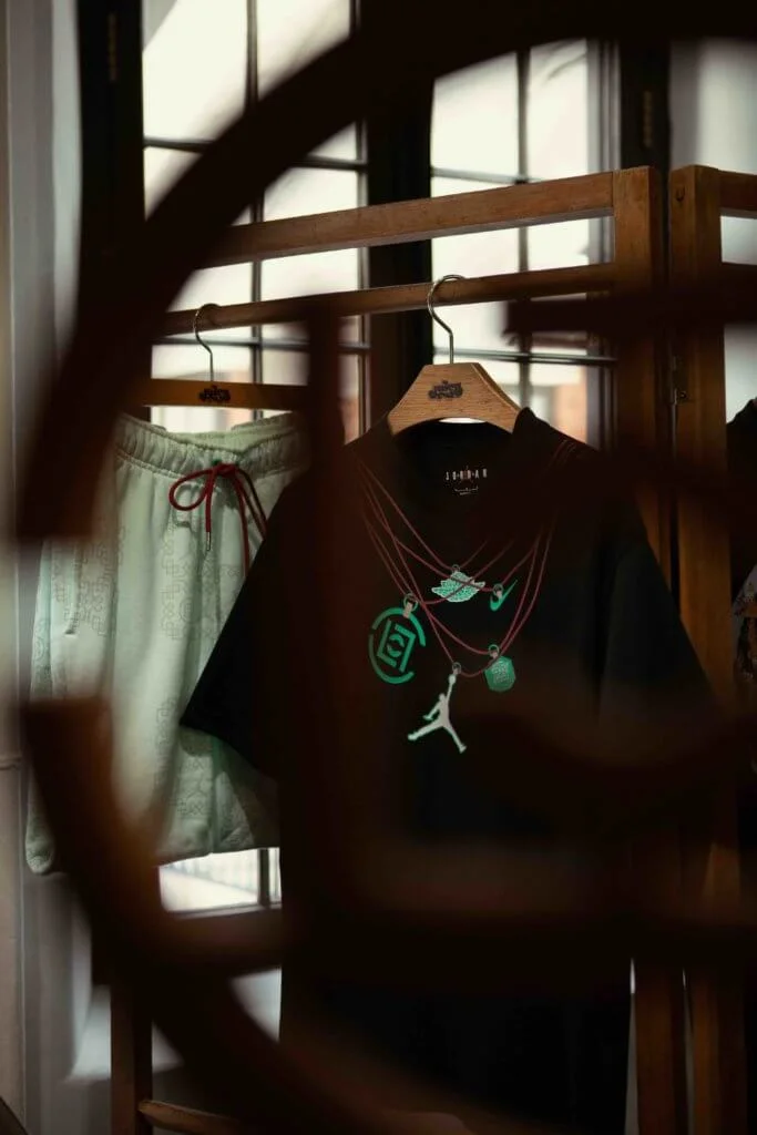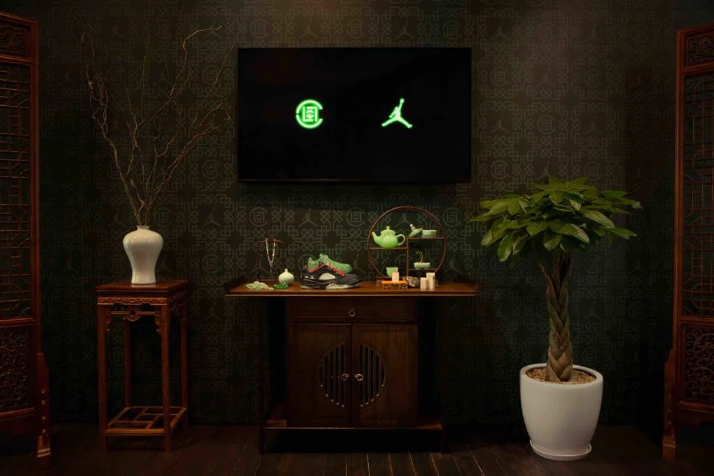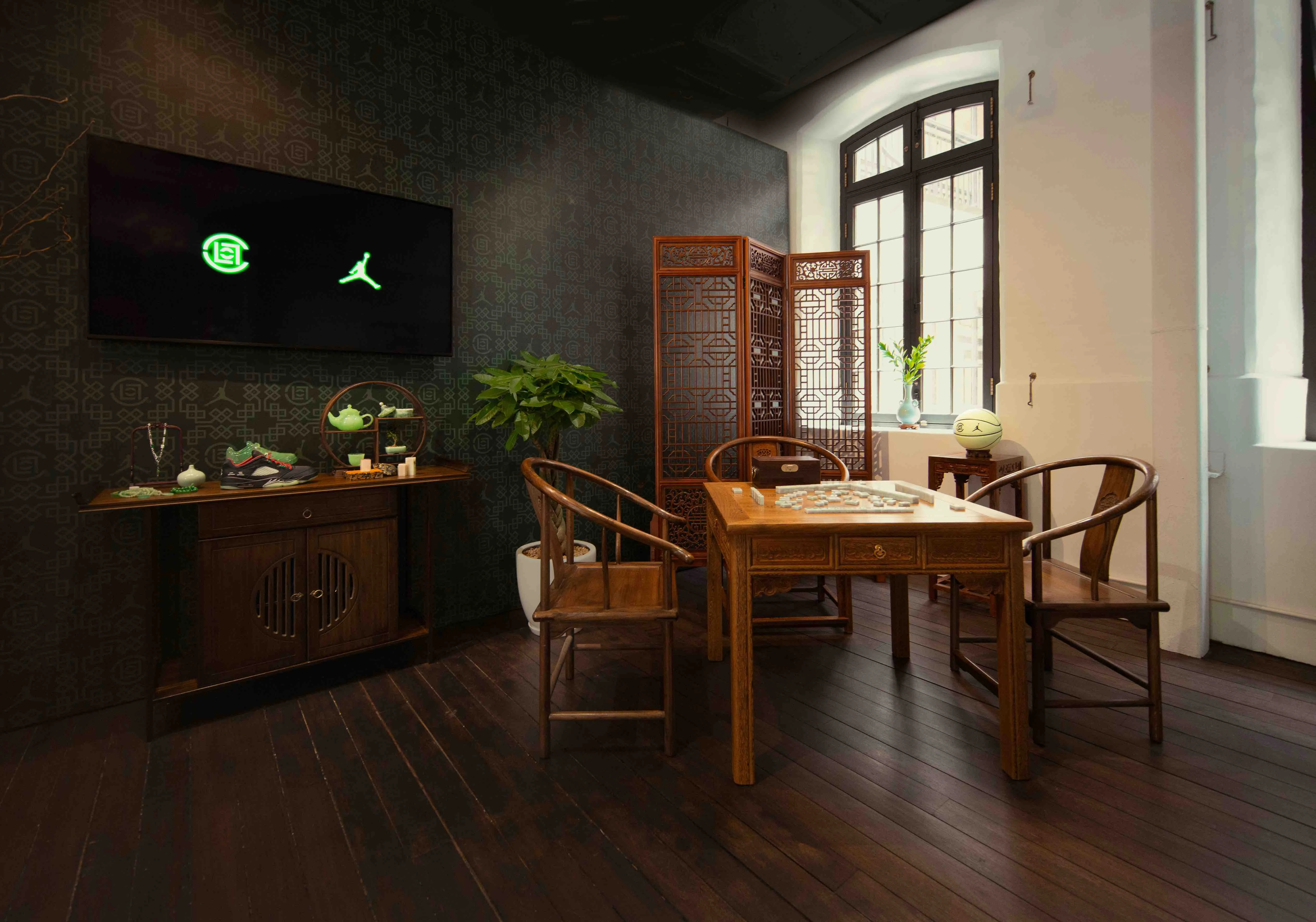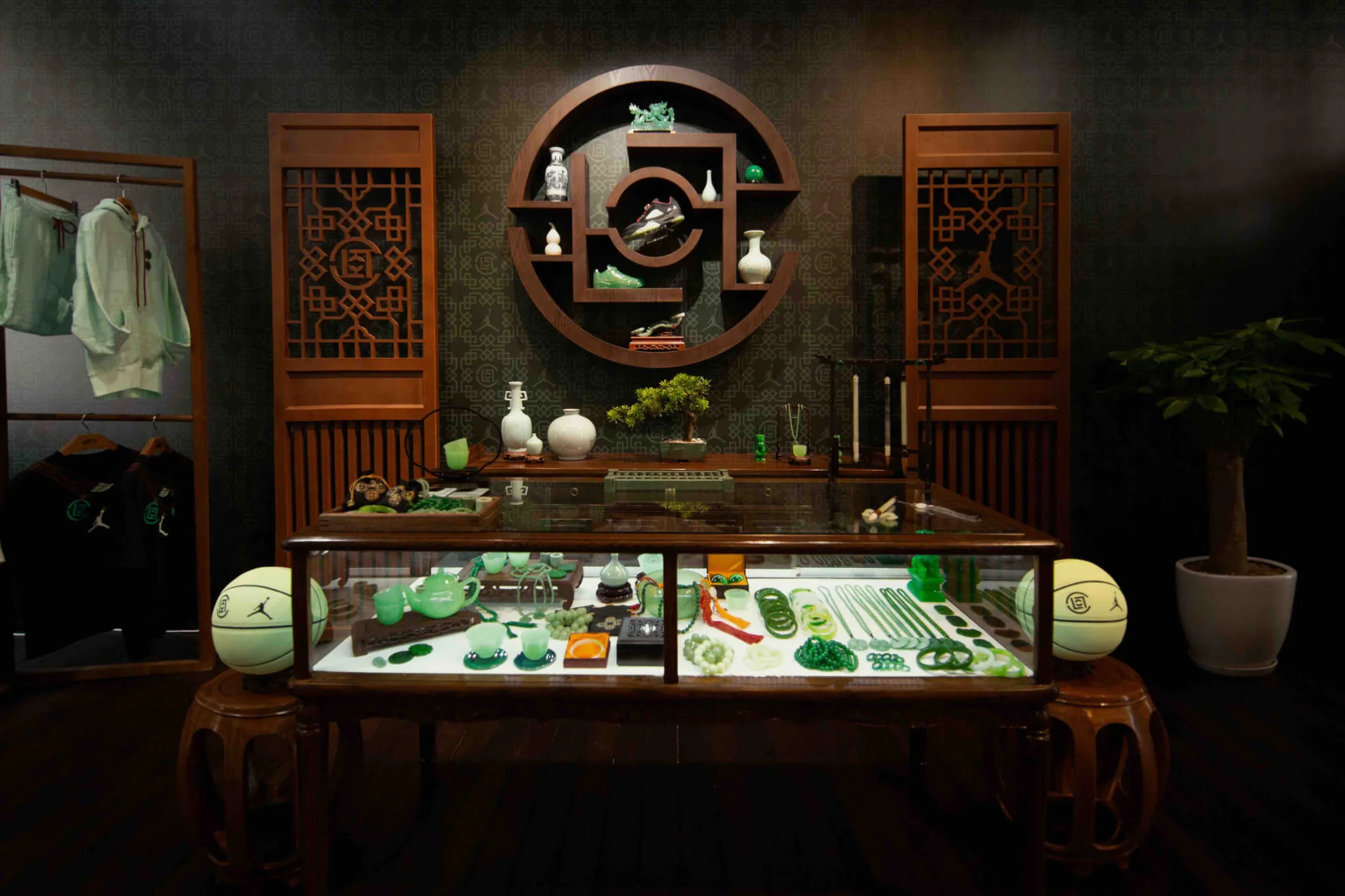設於中環大館 03 座 1 樓的期間限定空間,被改造成中式古董玉器店,處處洋溢著古雅氣息。 店內除了展示在 CLOT 形狀 木架上的 CLOT x AIR JORDAN「JADE 5 LOW」本體,及旁邊展出的一系列 CLOT x AIR JORDAN 膠囊服裝之外,取自今次聯乘鞋 款的設計元素亦隨處可見。 鞋墊上的聯名圖騰及印花,分別在牆紙及鏤空木屏風上展現,而麻將、象棋等一系列玉製品等,都一一添上 CLOT 及 Jordan Brand 的設計元素。 有興趣的朋友不妨去體驗一下古董玉器的神秘時尚魅力