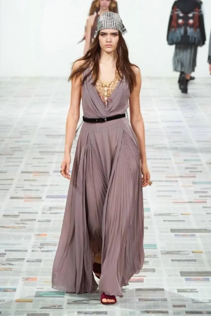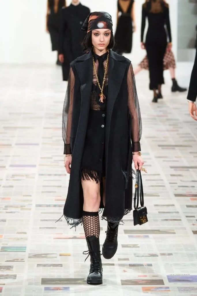 在藝術家Claire Fontaine打造之下,鋪滿報紙的地板與口號式短語霓虹燈裝飾成為秀場亮點,仿佛是一場女性革命的舞台。至於服裝方面,剪裁特別寬鬆,適合不同體態的女性穿著。品牌經典格紋元素運用到精致優雅的套裝與大衣上,短大衣、百褶裙、本季大熱的流蘇都充斥在這個系列之內;搭配領帶的窄領設計和黑白對比的用色使人眼前一亮。讓我最為印象深刻,反而是羽絨服的設計,對於Dior這個奢華品牌來說實在罕見,亦不難看得出Maria企圖在羽絨市場佔一席位。