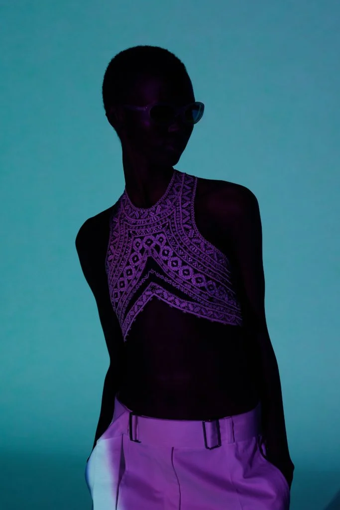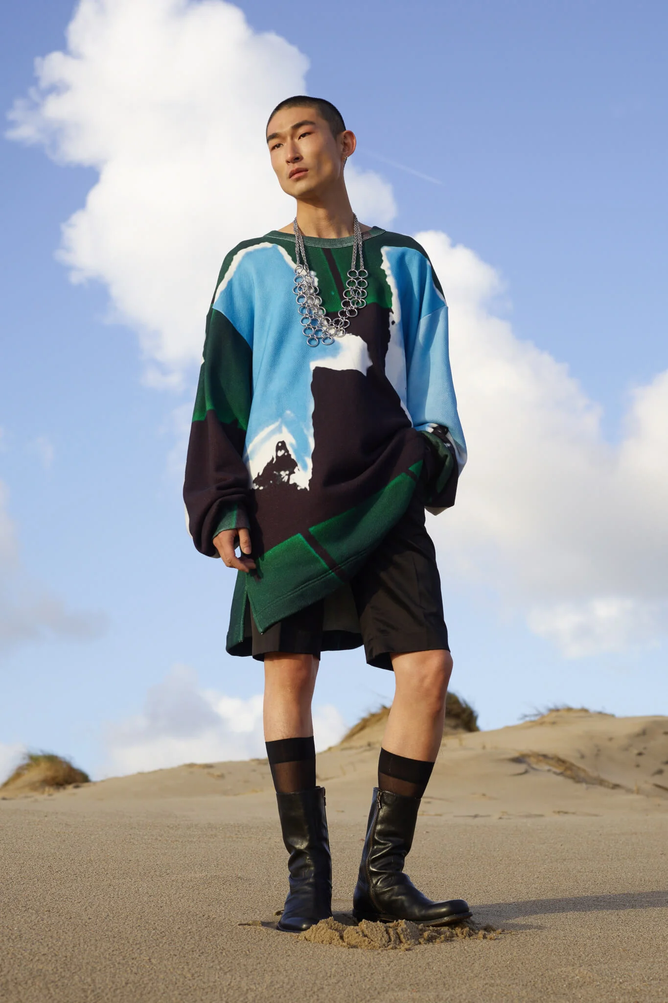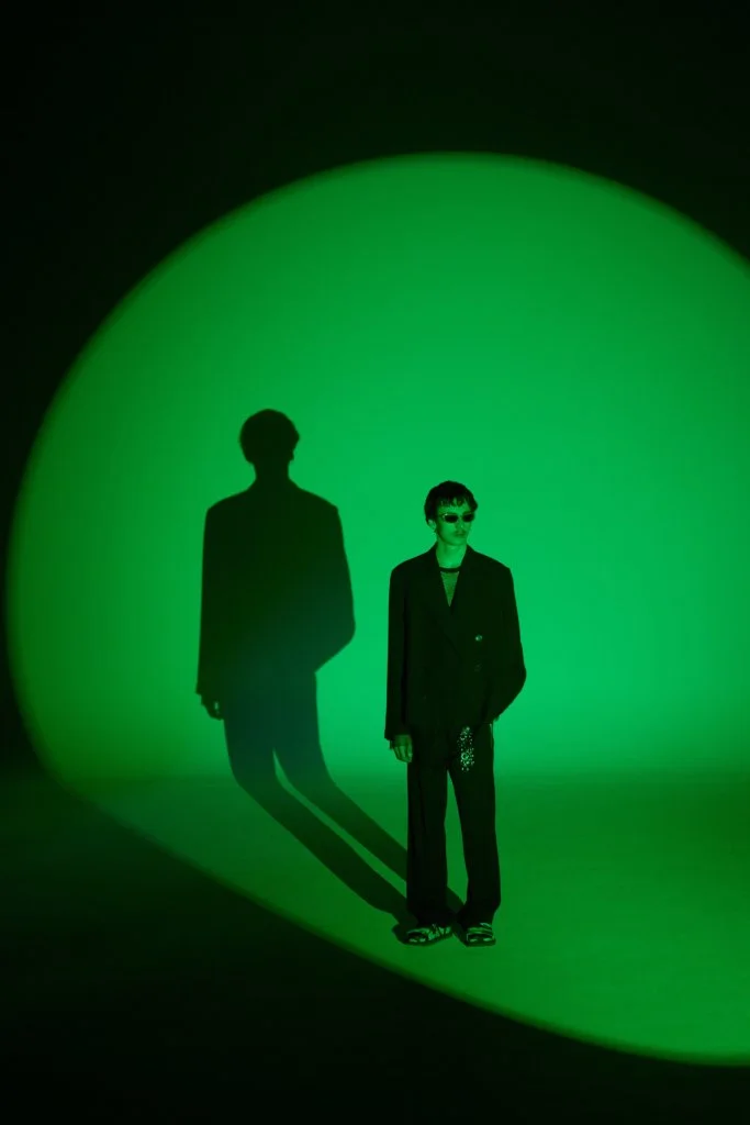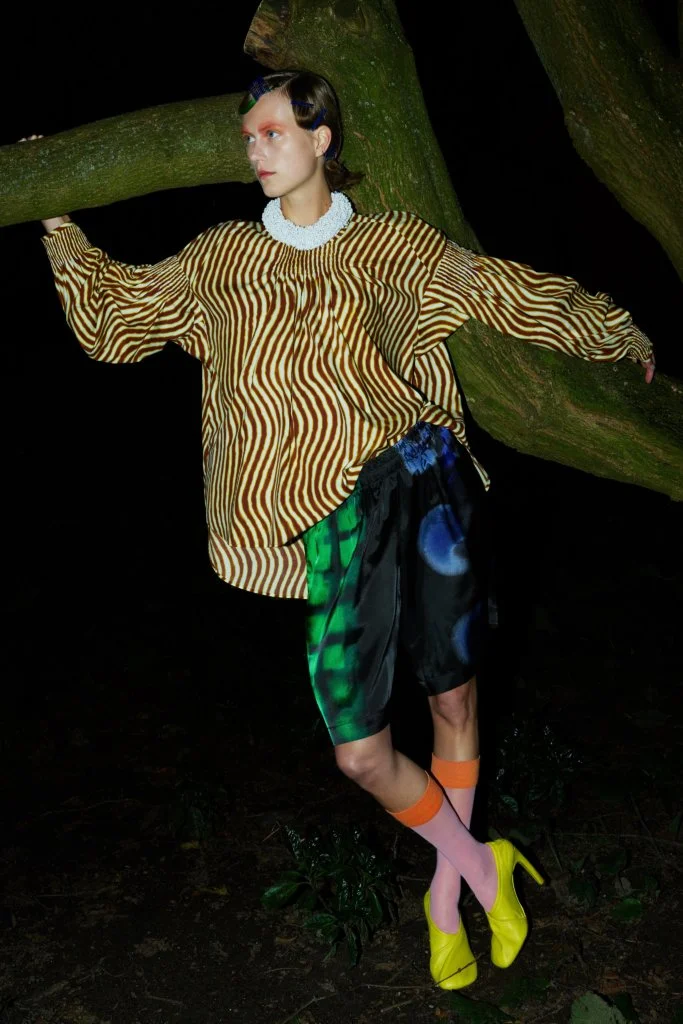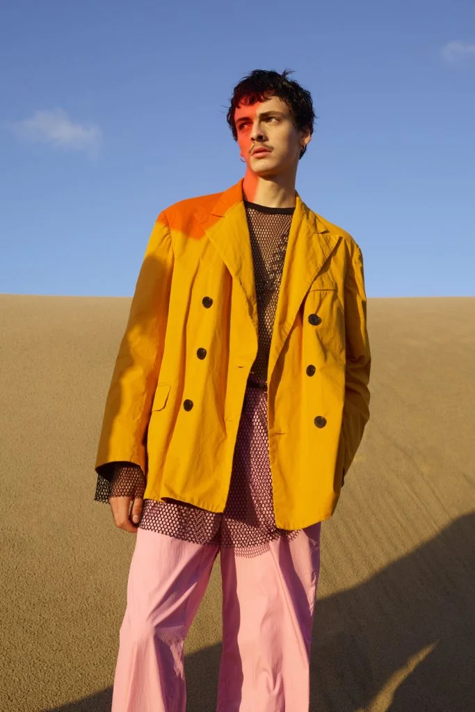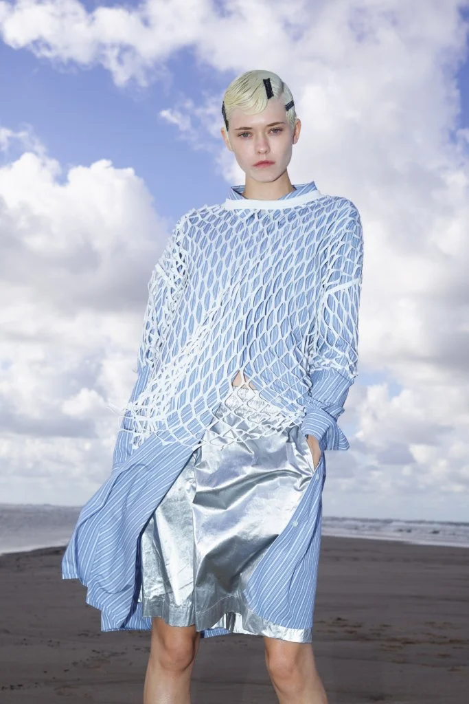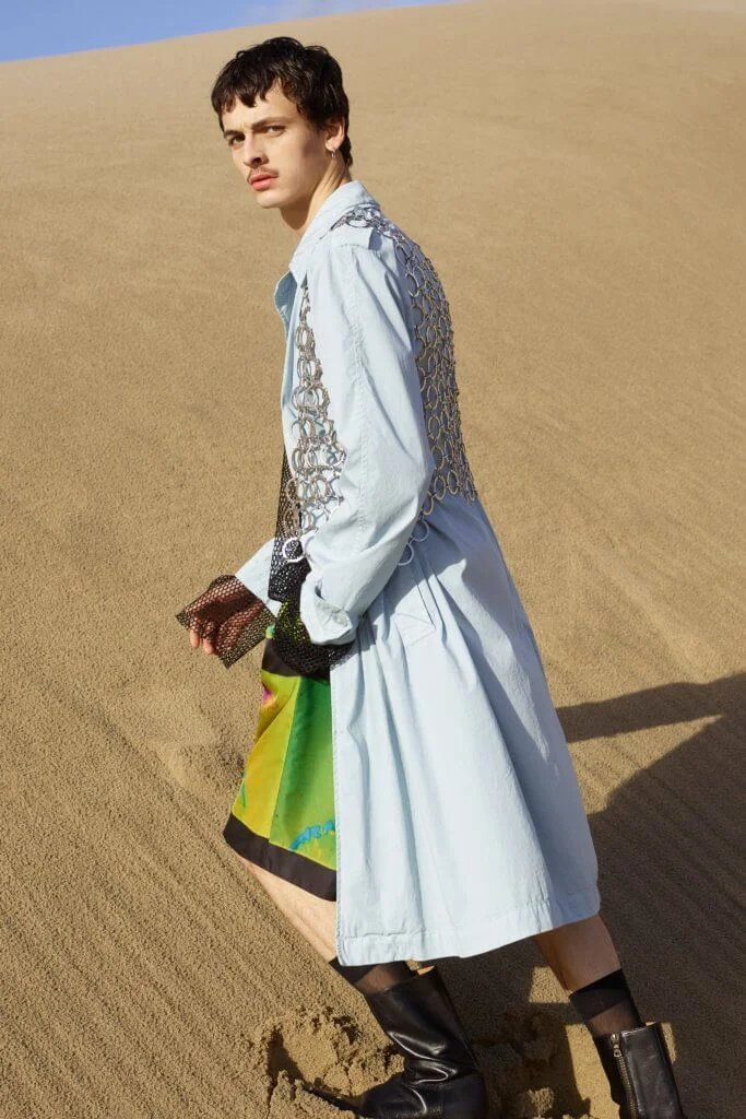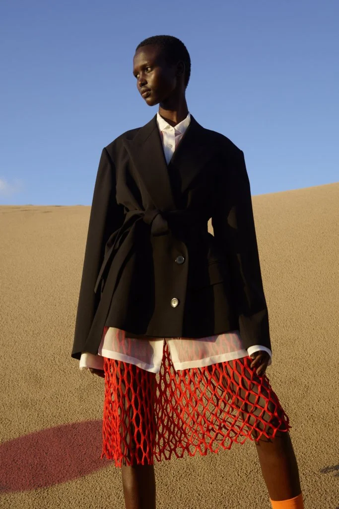 今年DVN以影像取代時裝騷,也將男女裝合併呈現,一是因為疫情所限,二是為減低成本所致。但影片和時裝照無損設計師的創作,四十六套服裝,同樣等於四十六張相片作品。Dries Van Noten接受訪問時說:「我們從來沒有拍攝廣告大片的習慣,雖然讓我們損失部分東西,卻也讓我們有機會學習,從而推動全新的創意。」以相片和影片作為本位去設計服飾,總讓造型充滿層次,絲質的襯衫、半截裙配闊袖襯衫和漁網上衣,長大衣配百慕達短褲,絲襪配短靴,非常精彩。是次造型照在鹿特丹的沙灘和影樓中拍攝,前者帶一眾荒涼氣息,後者卻以顏色燈光營造迷幻的未來感,拼在一起卻又異常和諧,大概也是Dries Van Noten的功力所在。