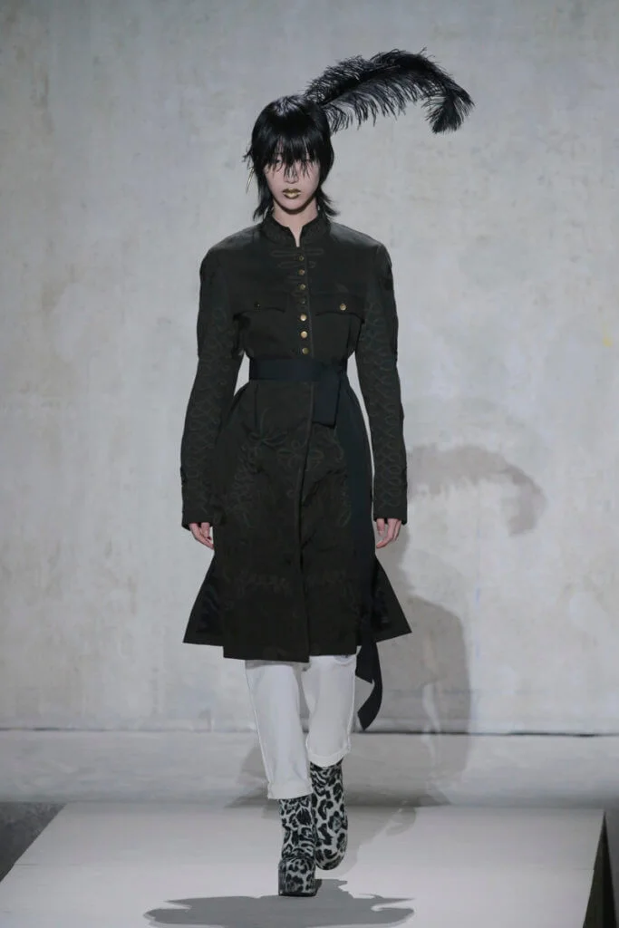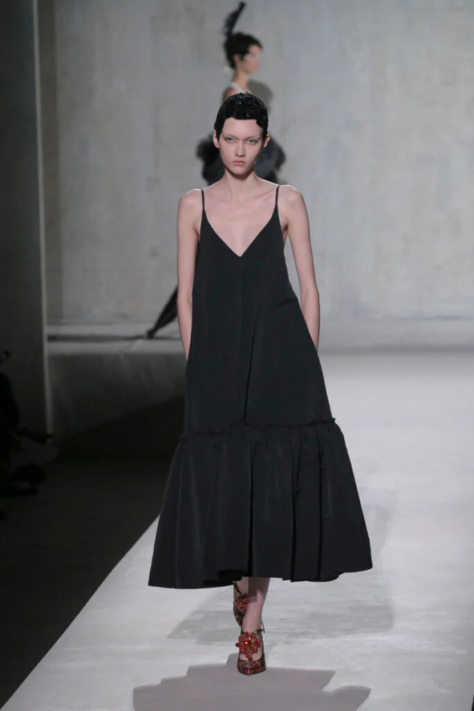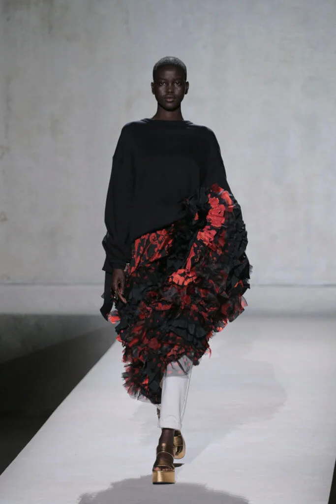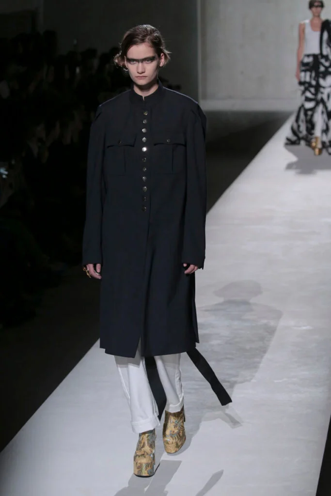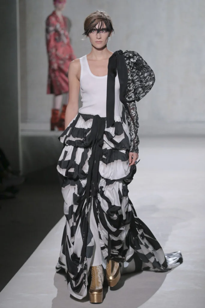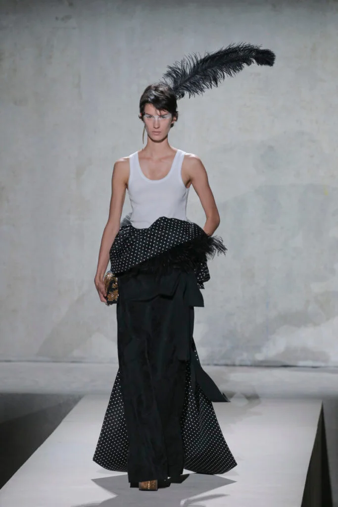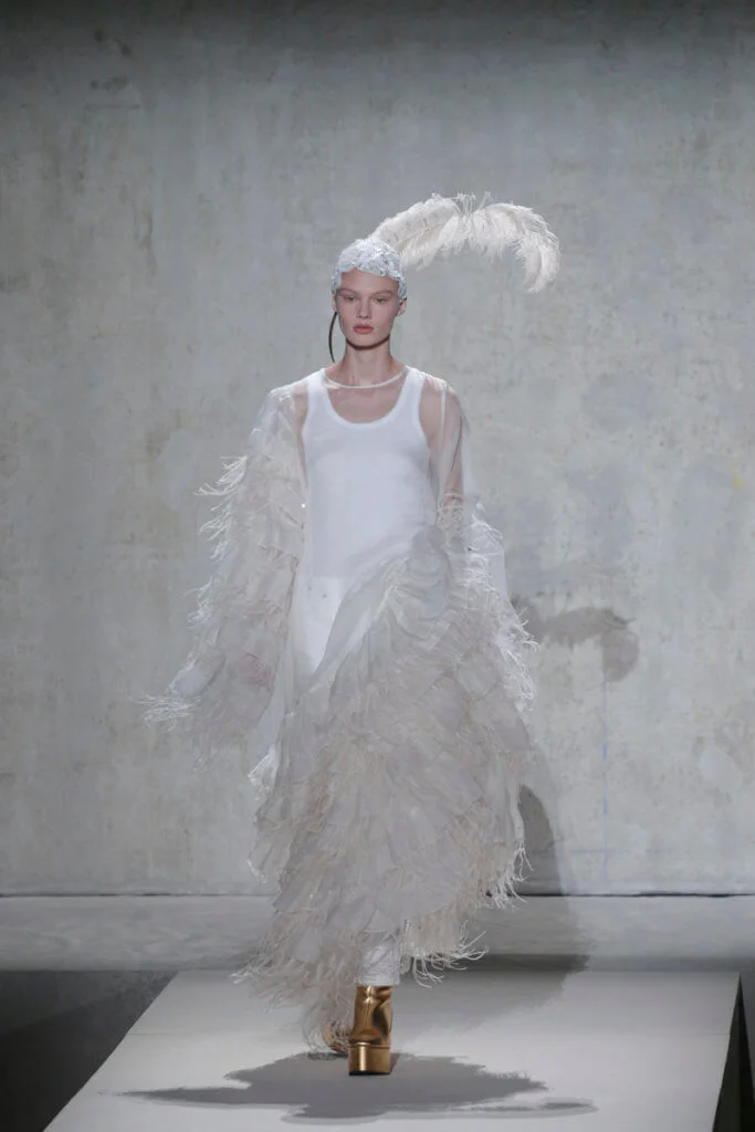 時裝秀以一套全白的羽毛蕾絲長裙閉場,薄紗從腰間延伸出一層層的皺褶和流蘇,彷彿天使下凡,與Van Noten和Lacroix同場,為Dries Van Noten時裝秀完滿落幕。