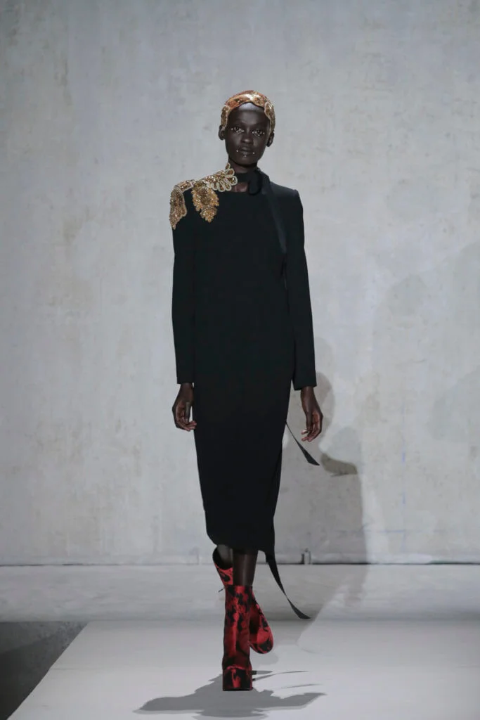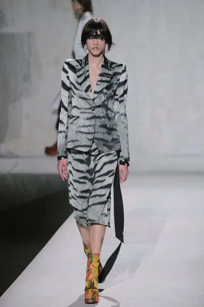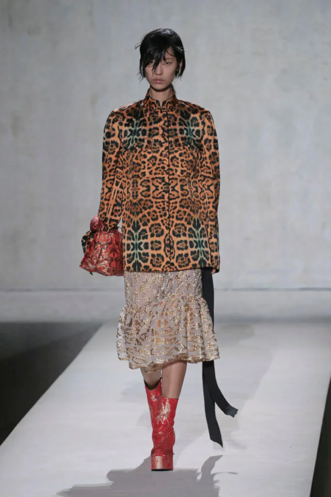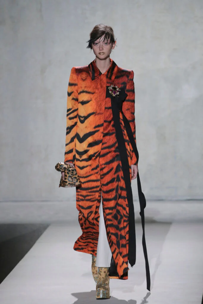Van Noten認為,如今世界無論在經濟、政治還是環境上,都越趨分裂和單調乏味,或者他的極繁主義(Masimalism)可以為創作帶來更多活力和靈感。所以這一季出現了橙紅色漸變的虎斑和釣紋,還有色彩斑斕的標誌性印花,以誇張的羽毛裝飾和拖地長裙吸引大家的眼球,毫無保留地宣示系列的熱情。