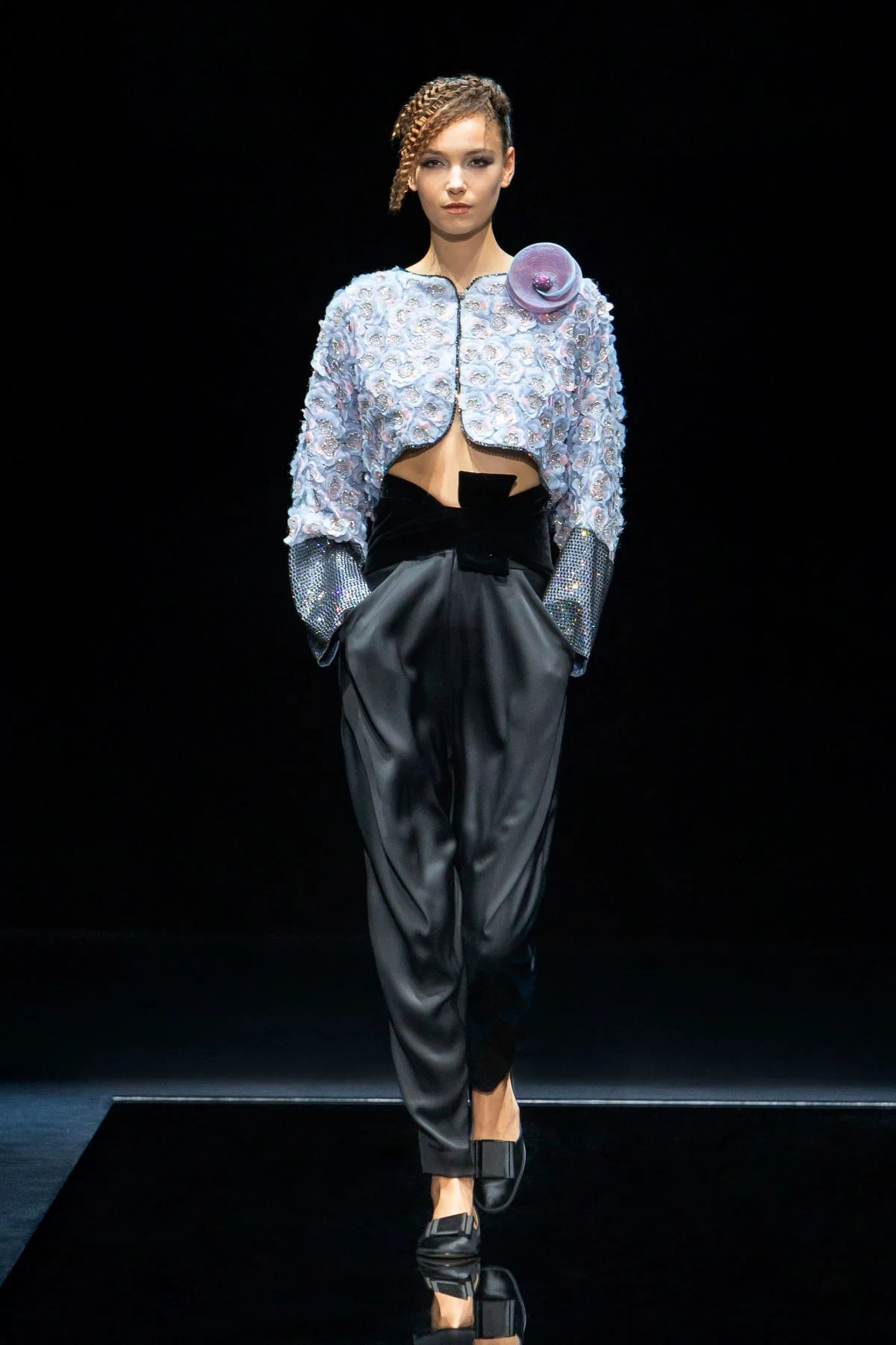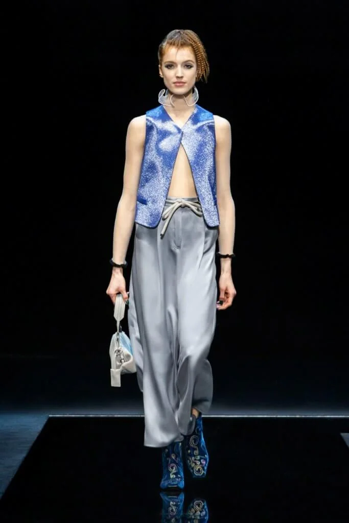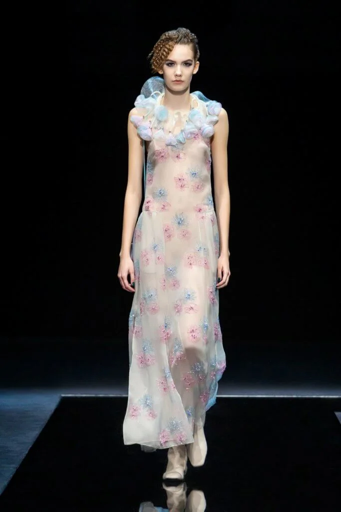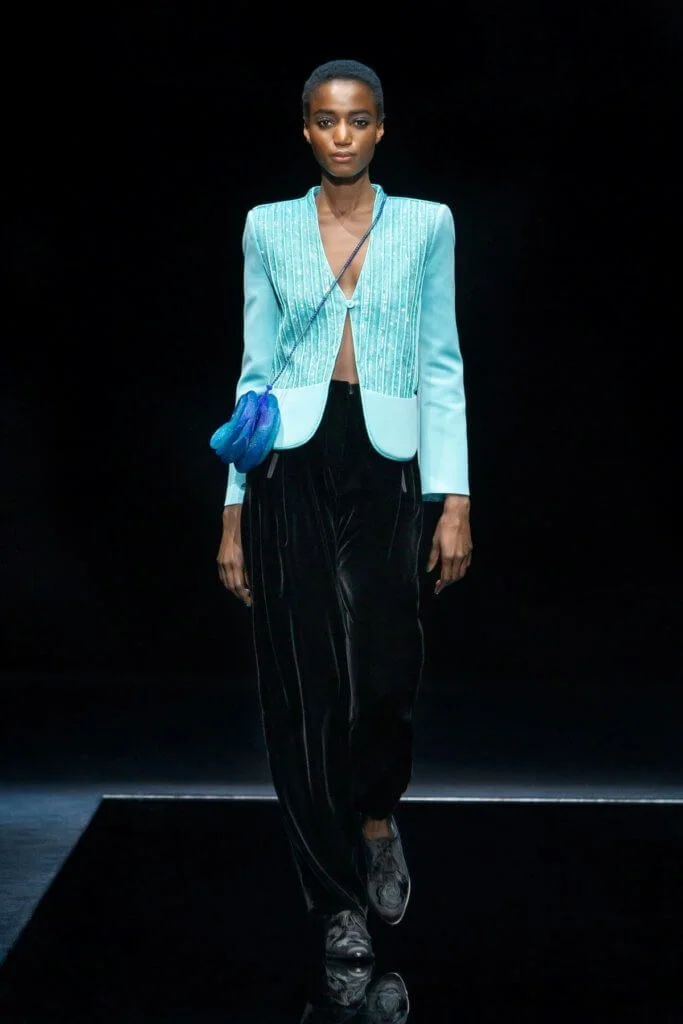 Giorgio Armani在優雅沉穩的基礎下,風格不斷演進,來到今個季度,不忘彰顯女性氣質與個性,運用淡雅水色、微光綠松石色、淺紫色和淺粉色,塑造女性柔和浪漫的一面。在用色上,顯見品牌刻意打造鮮明對比效果,粉色與黑色,猶如晝夜對話。系列大肆採用具絲光質感的天鵝絨,例如黑色天鵝絨外套綴上彩藍色領位和袖口飾邊,或是黑色天鵝絨長褲搭配天藍色閃片緞質短外套,不花巧,但時尚,深化了優雅的氣派。