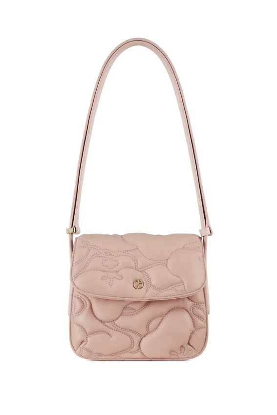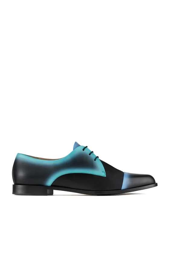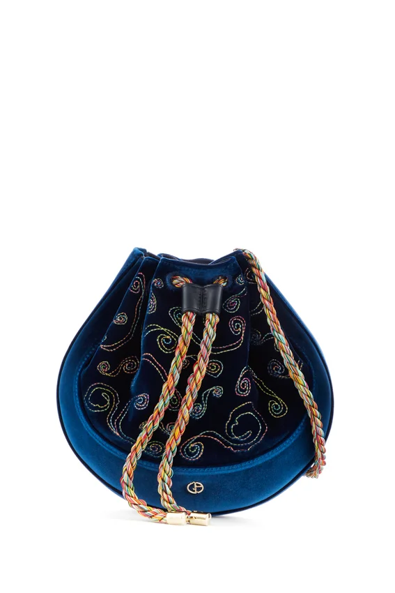 2021秋冬鞋履和手袋設計,同樣注入深淺色調對比和簡約幾何圖案元素。皮革手袋和平底鞋,以粉紅、藍與黑色互搭營造出漸變色拼湊效果,帶有夜間星空夢幻的感覺。其中一款手袋採用藍黑色天鵝絨布製成,袋面綴有不規則的螺旋形圖紋刺繡,配上彩色索帶,展現時尚優雅的民族風。