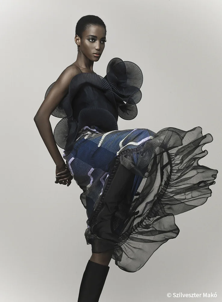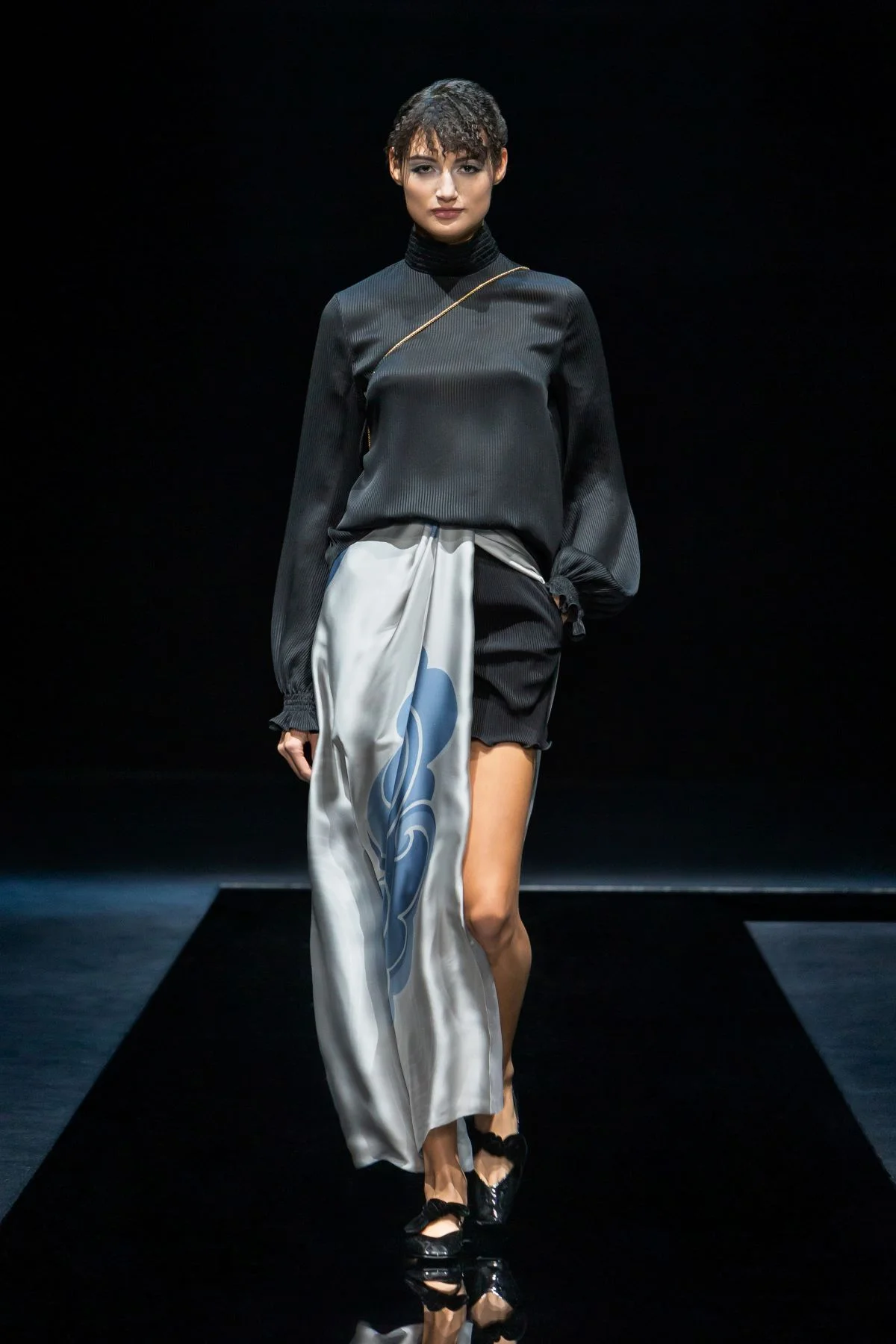 為了呼應夜色概念,系列採用水晶格紋的閃耀印花、抽象的星形花序圖案作為點題細節。在剪裁廓形上也極其講究,翼形長褲、長款連身裙、高叉半截裙等,模特兒在暗黑天橋上一擺一晃,頃刻帶出優雅飄渺的意境。部分設計採用波浪形立體剪裁,如在大衣的領位邊沿飾上ruffles,為簡約大衣平添生氣,亦豐富了衣服的視覺美感。