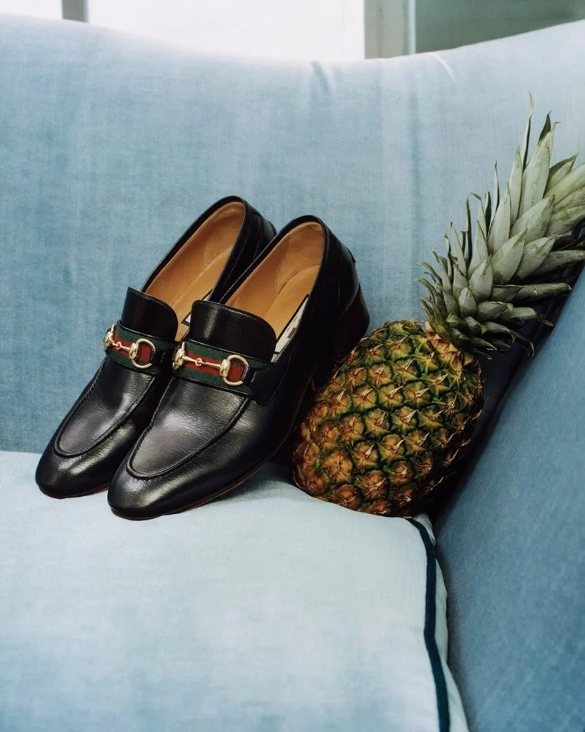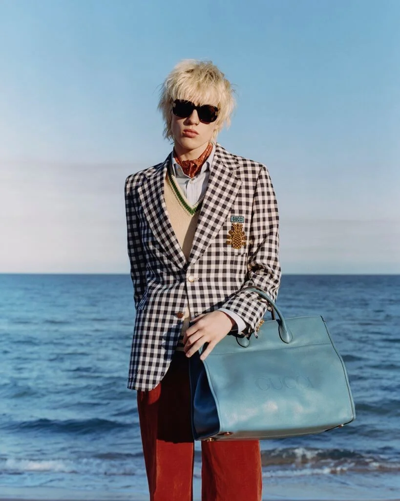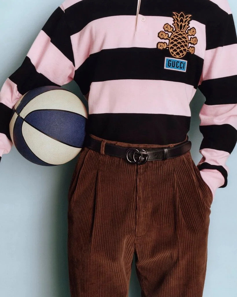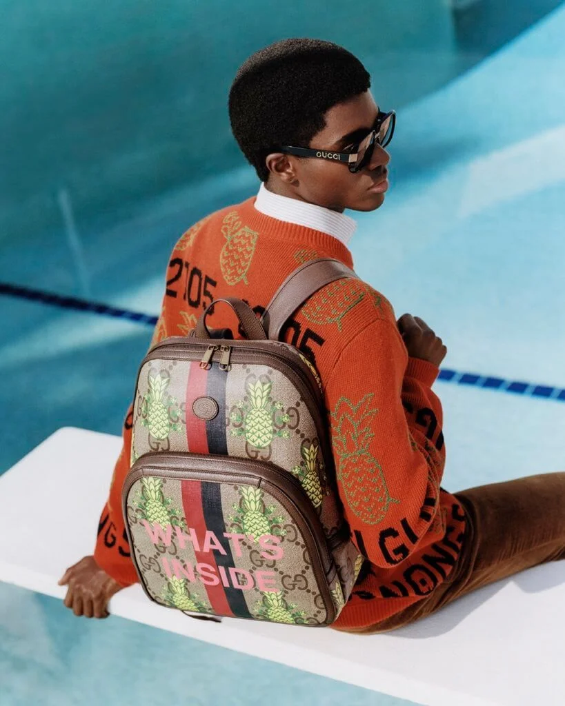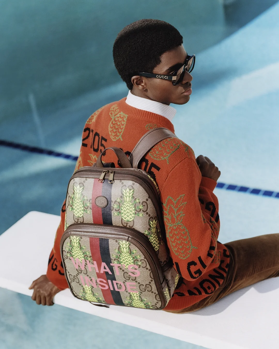 系列結合了校園風和街頭時裝美學,粉彩色系與較深的藍色和綠色完美融合,洋溢輕快愉悅的氛圍。而在服飾中常見的「22,705」數字元素,則代表了歷來在歌詞中提及 Gucci 的歌曲數量。系列亦包括運動鞋和皮革配飾,菠蘿圖 案以鮮明的黃色印花呈現,在 GG supreme 帆布烘托下更加奪目。