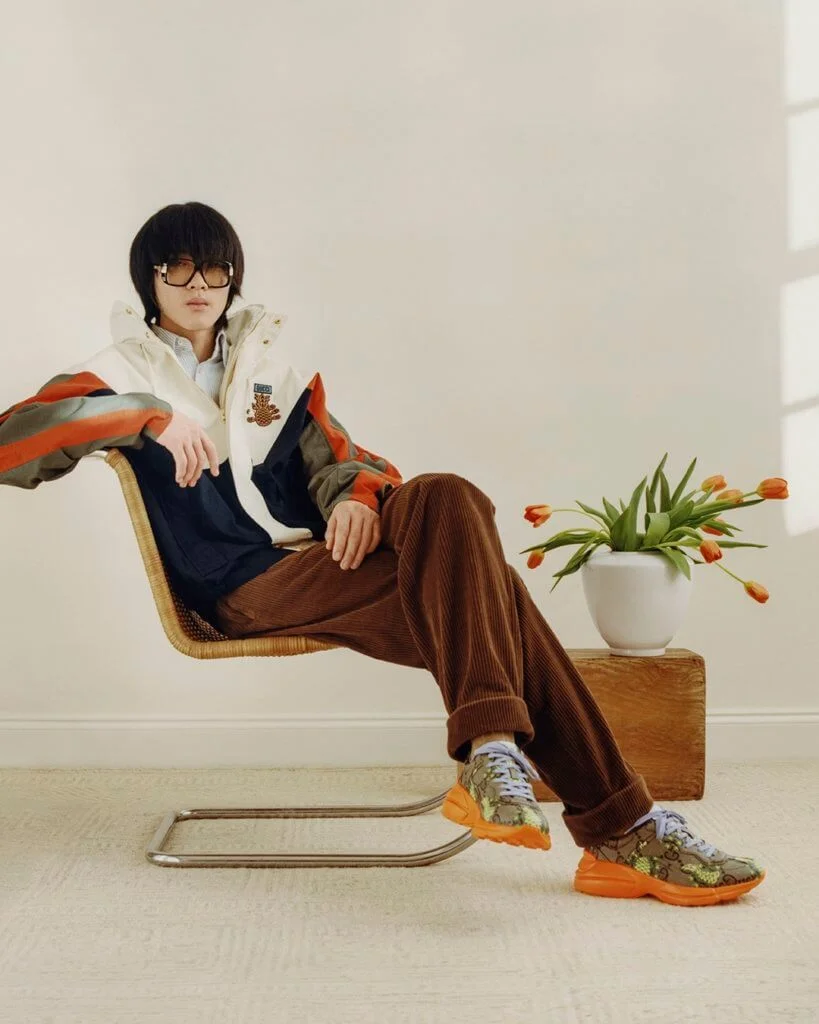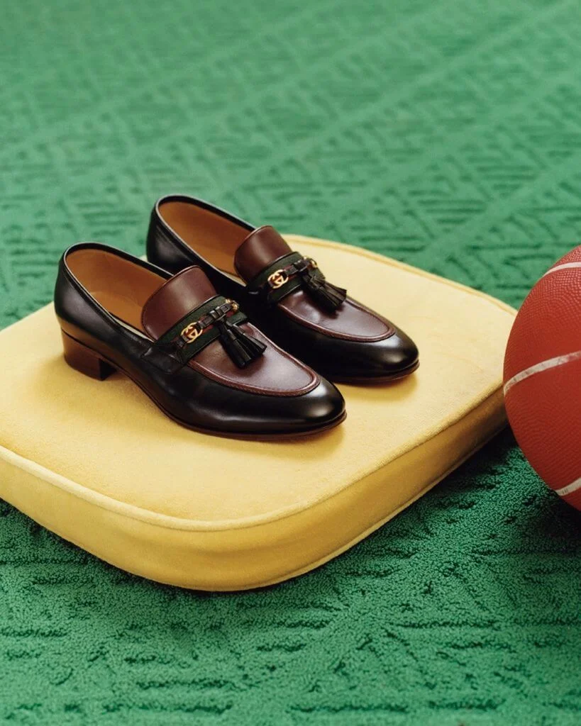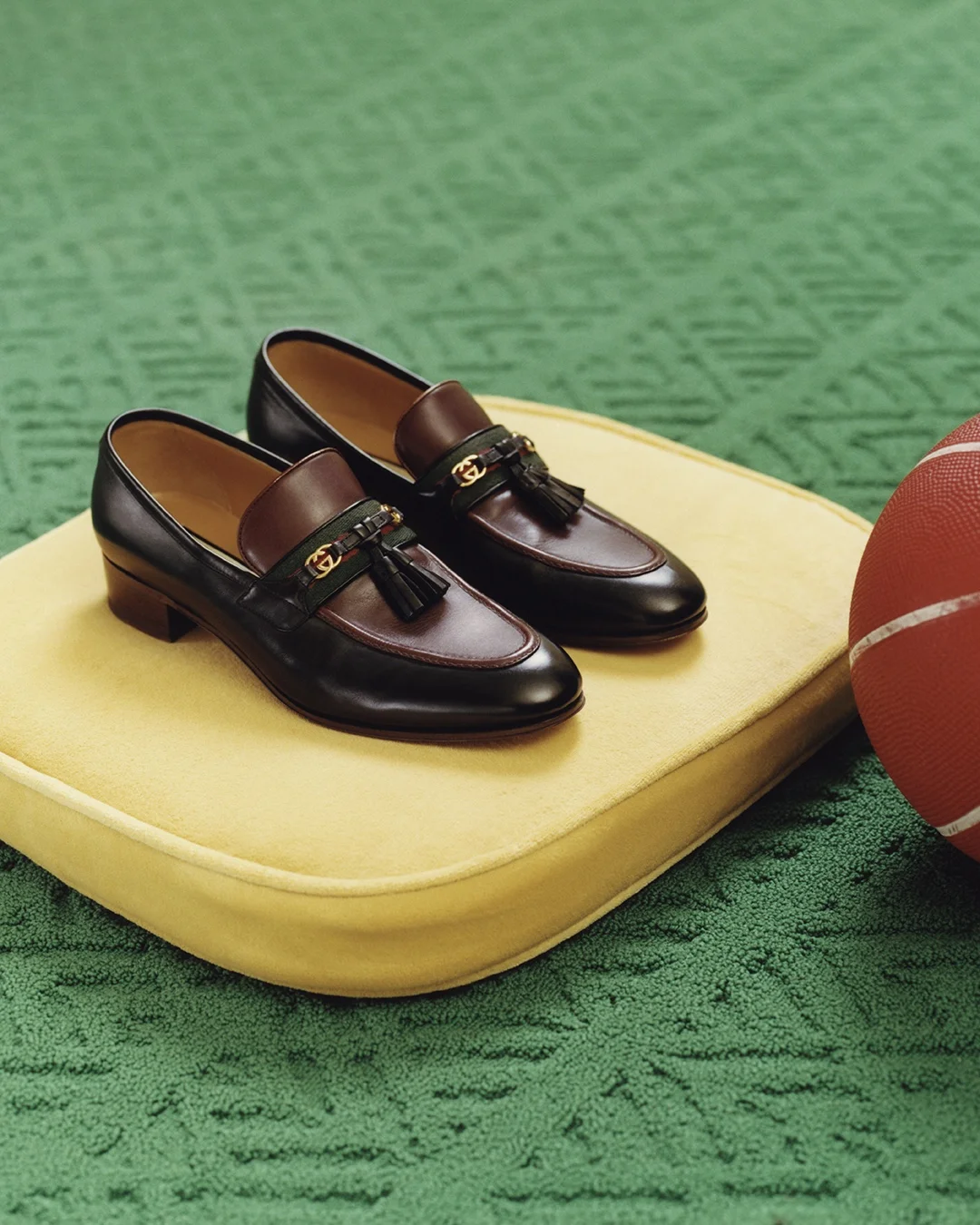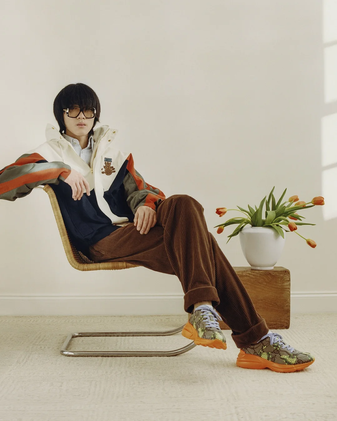 系列結合了校園風和街頭時裝美學,粉彩色系與較深的藍色和綠色完美融合,洋溢輕快愉悅的氛圍。而在服飾中常見的「22,705」數字元素,則代表了歷來在歌詞中提及 Gucci 的歌曲數量。系列亦包括運動鞋和皮革配飾,菠蘿圖 案以鮮明的黃色印花呈現,在 GG supreme 帆布烘托下更加奪目。