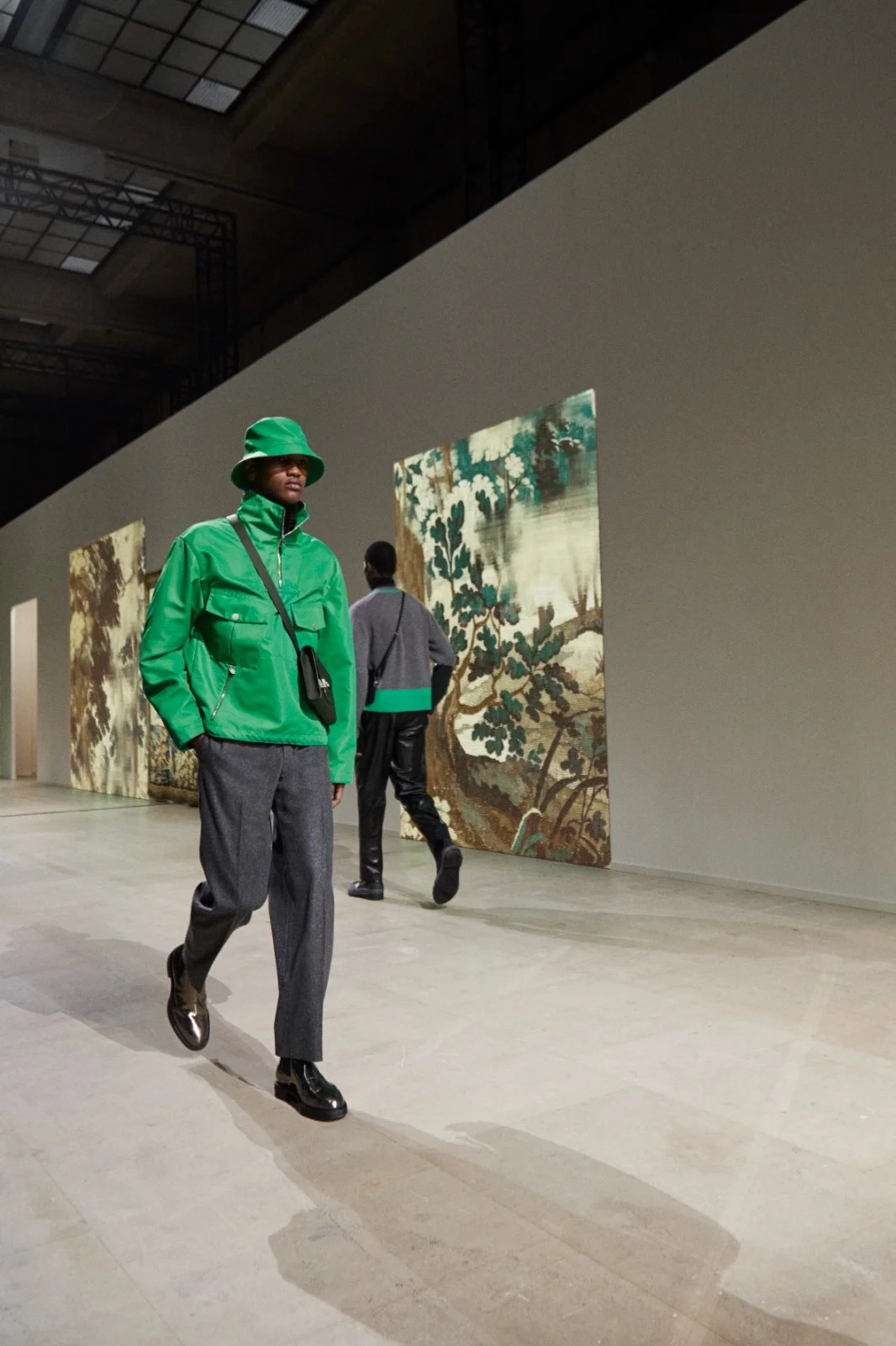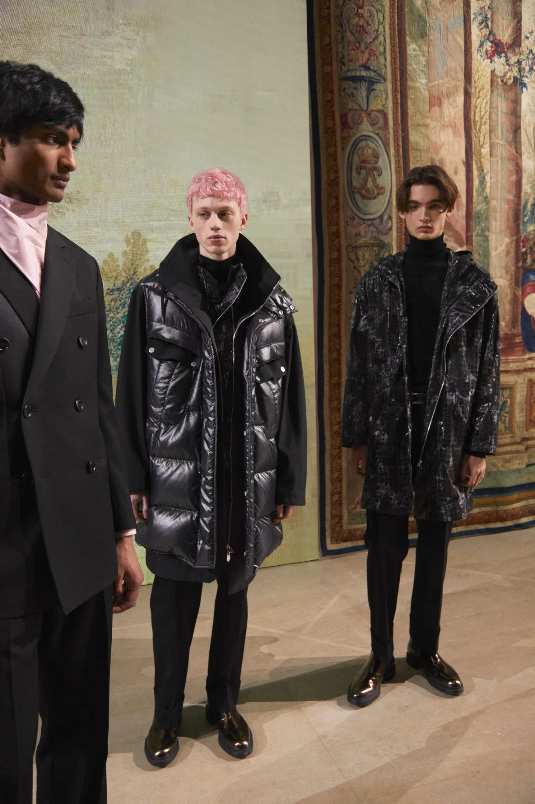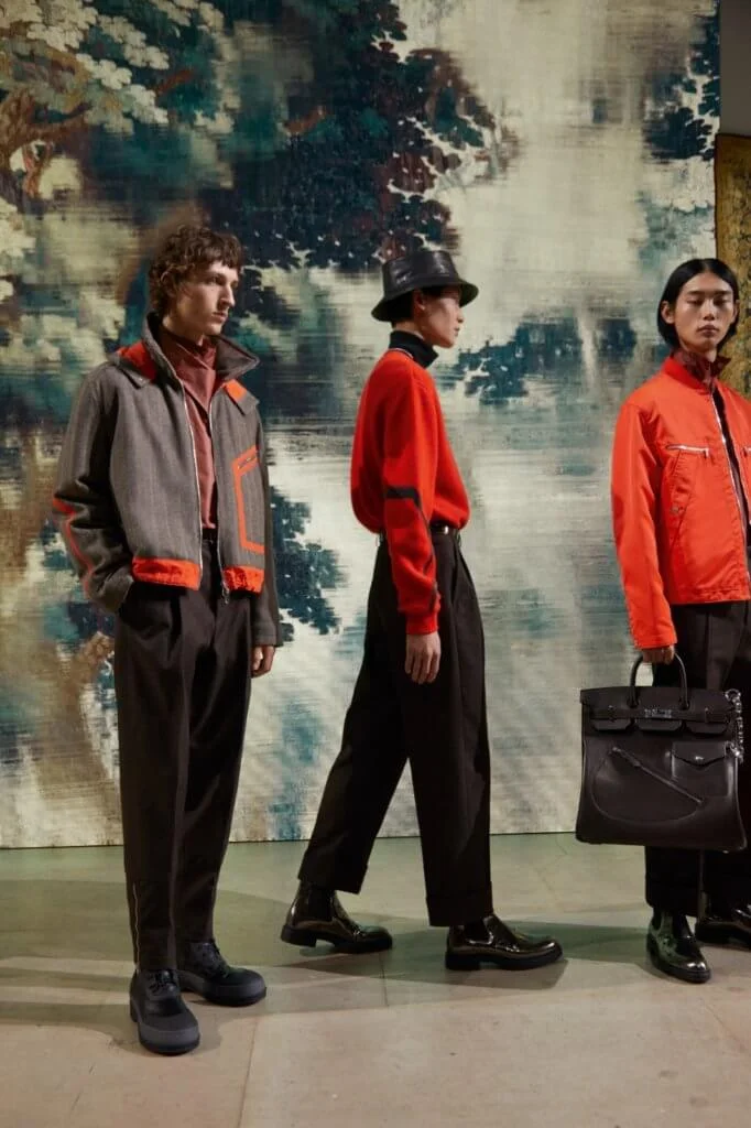 冬季男裝系列時裝秀由 Véronique Nichanian 與劇場導演 Cyril Teste 共同設計,二人將展廳收藏的掛氈鋪在牆上,襯托出精緻的服飾。系列大多以合身剪裁為主,以不同材質如小羊皮內裡配上派克外套、皮革大褸內搭絲綢襯衫等,透過不同材質帶來豐富層次感。此外,本系列以杏色、灰色和啡色等大地色為主,襯上鮮綠色、鮮橙色和淺藍色等,用色和諧舒服,緊扣矛盾與精緻的主題,同時又不失 Hermès 的優雅。
