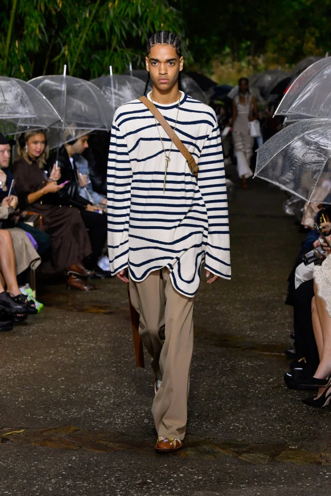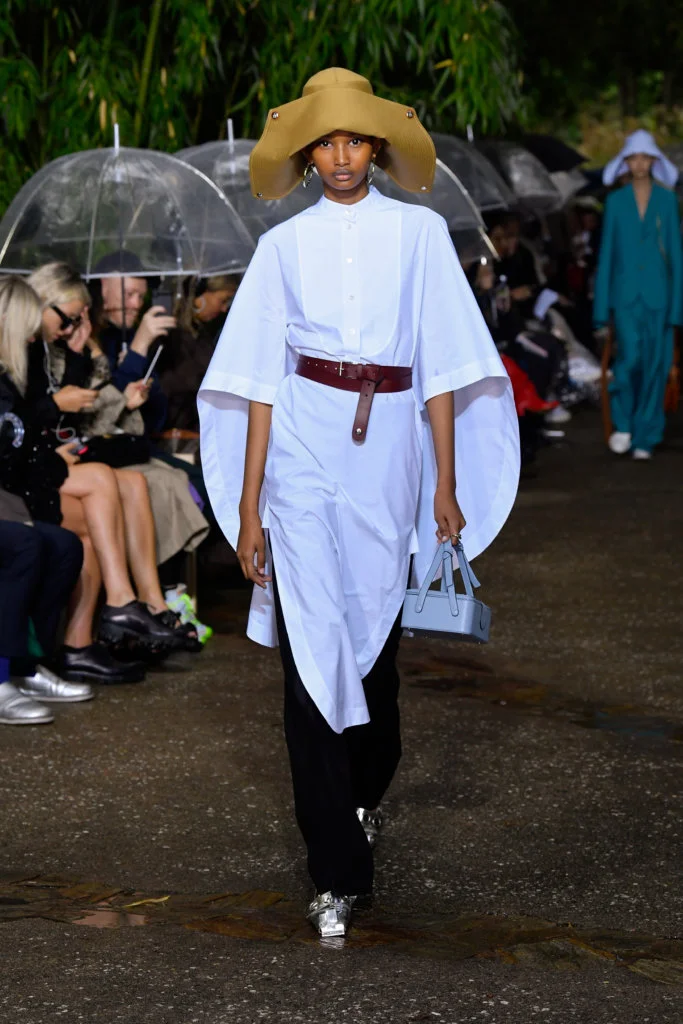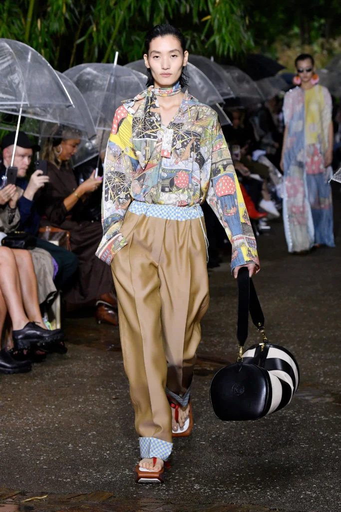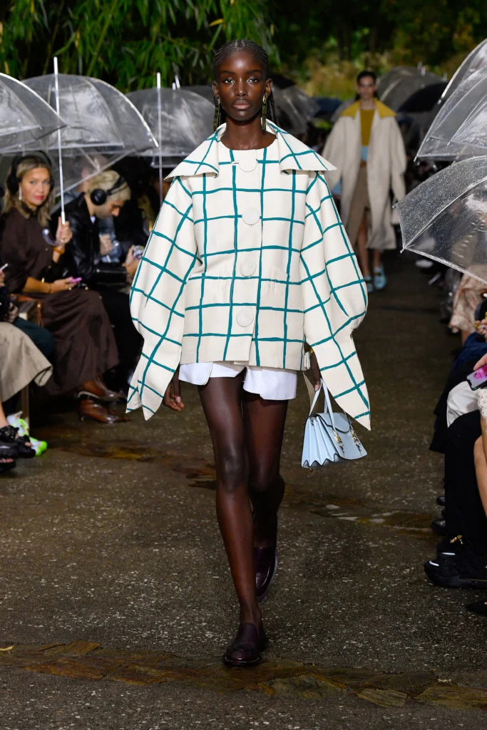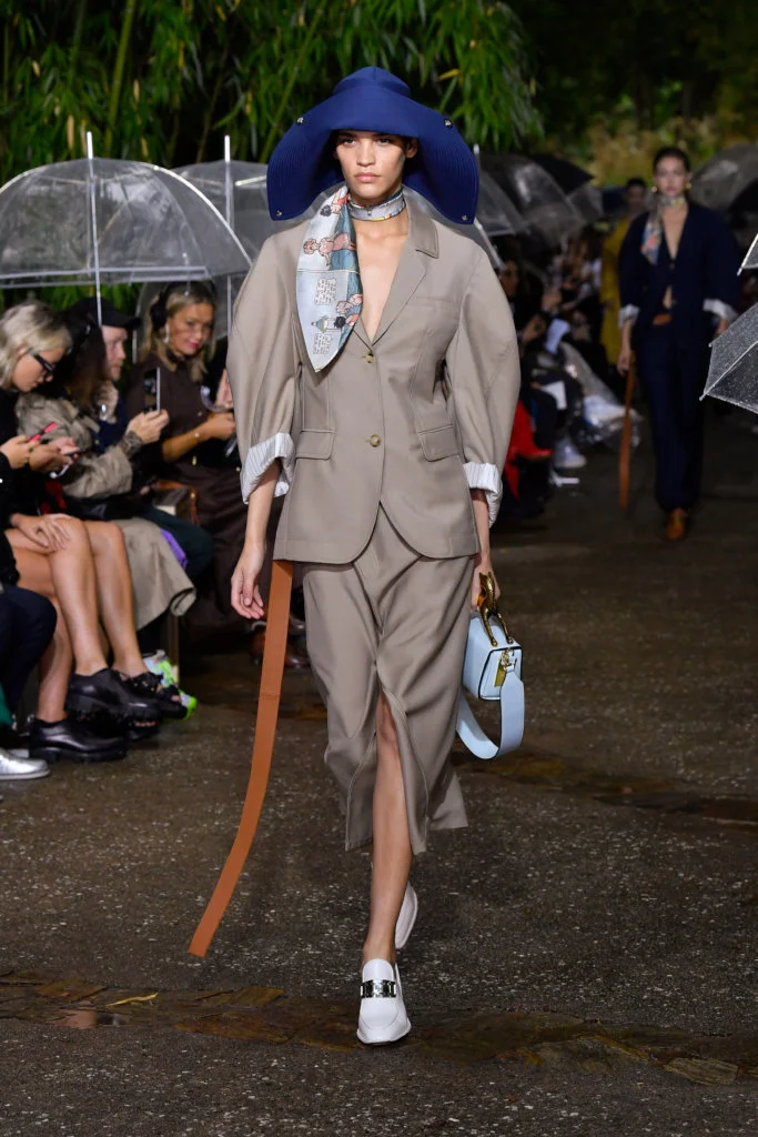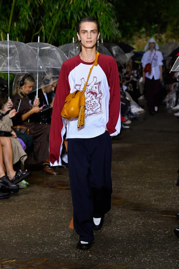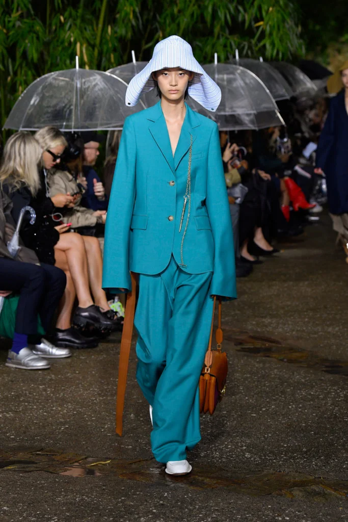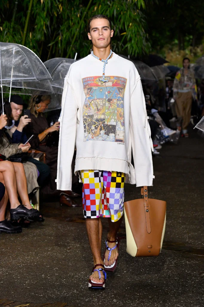 冒著雨在室外撐傘看騷,戴上耳機聽著配樂《Lord of the Flies》,雖然天有不測之風雲,卻不減Lanvin的魅力。從誇張俐落的圓肩斗篷式西服到漫畫《小尼莫夢鄉歷險記》(Little Nemo in Slumberland)的印花圍巾和上衣,Bruno Sialelli以他的方法訴說自己的童年回憶,為時裝賦予懷舊情趣。