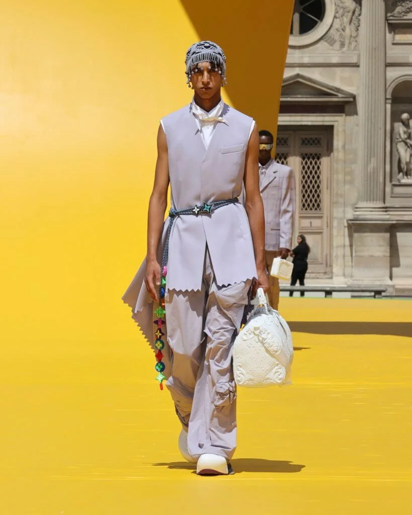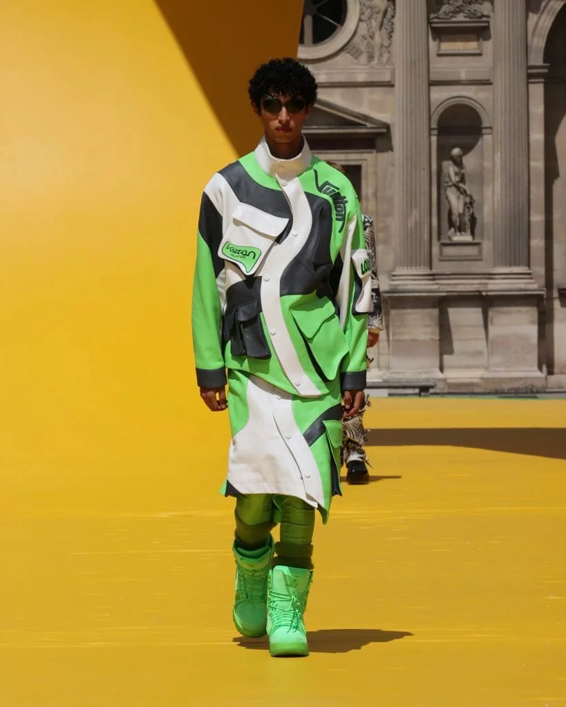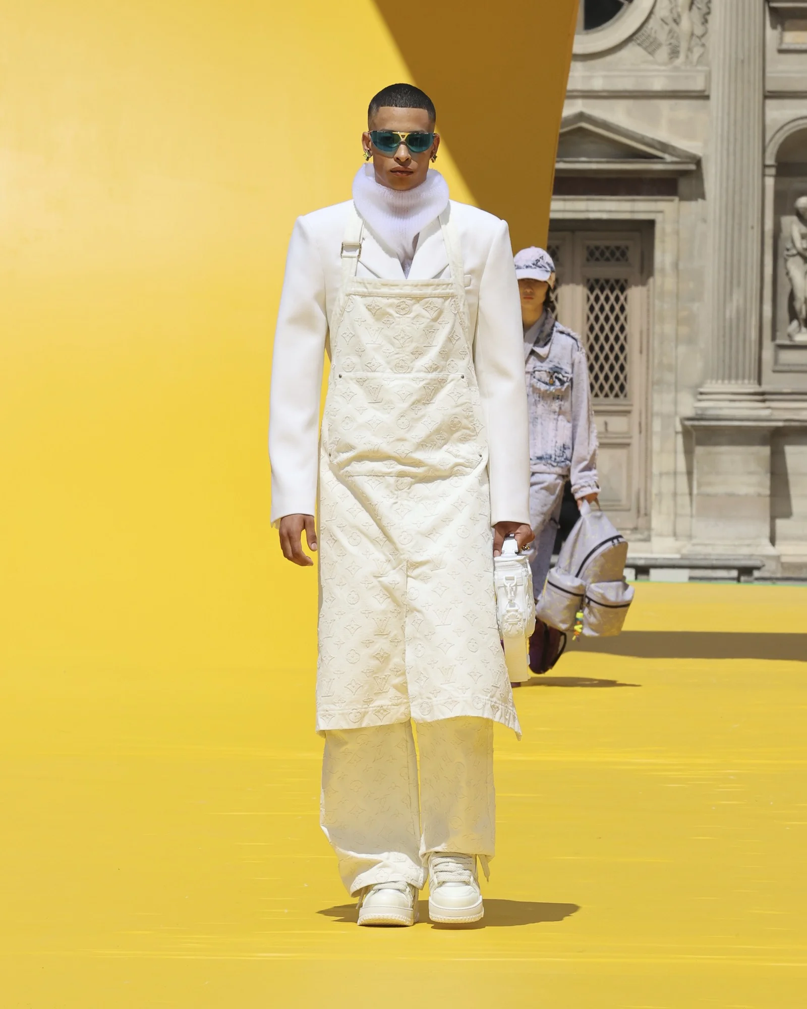 今季 Louis Vuitton 2023 春夏男裝系列,正好以一段男孩成長日記為主題。將羅浮宮卡利庭園想像成一座大型遊樂場,設置了巨型的玩具車賽道,成為任由想像力飛馳的黃磚路,將充滿童真的幻想活現眼前。俐落線條勾勒而成的輪廓,巧妙演繹縮小或闊大的比例,呼應男孩長大後衣服終於合身或已經穿不下的概念。同時向90年代滑板愛好者的衣著打扮致敬。