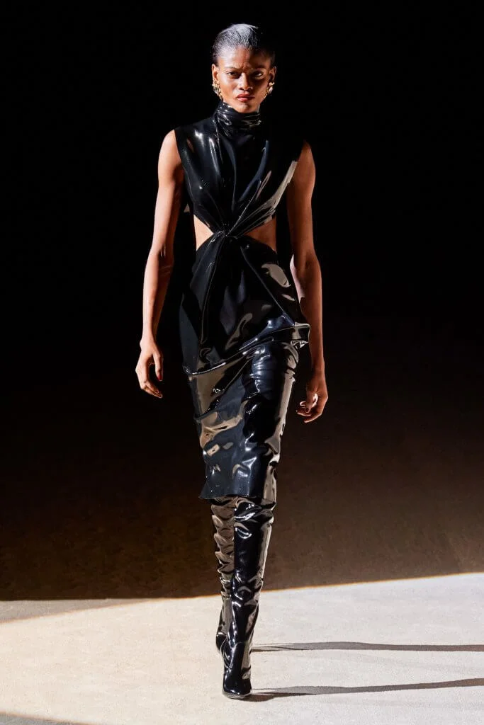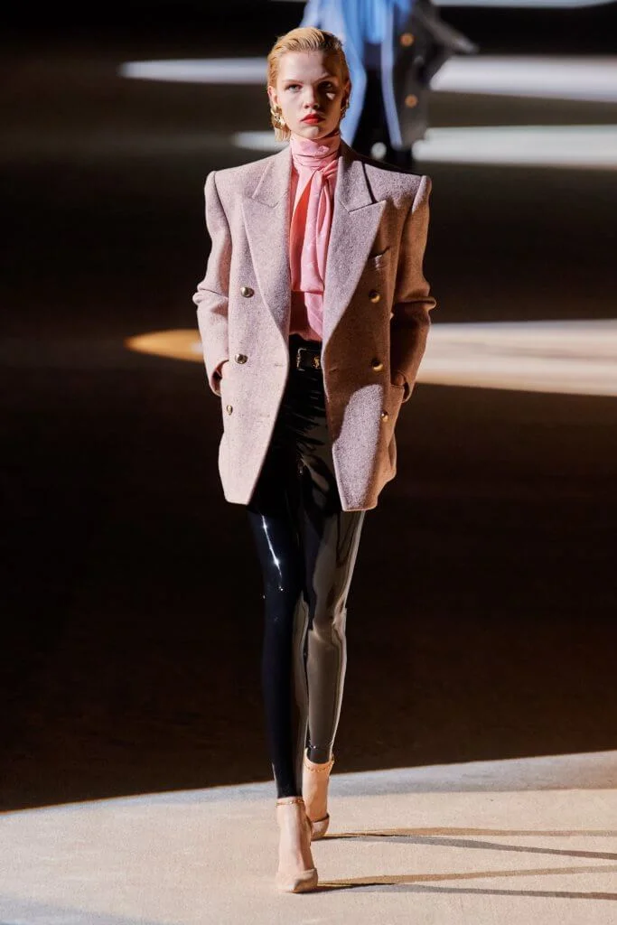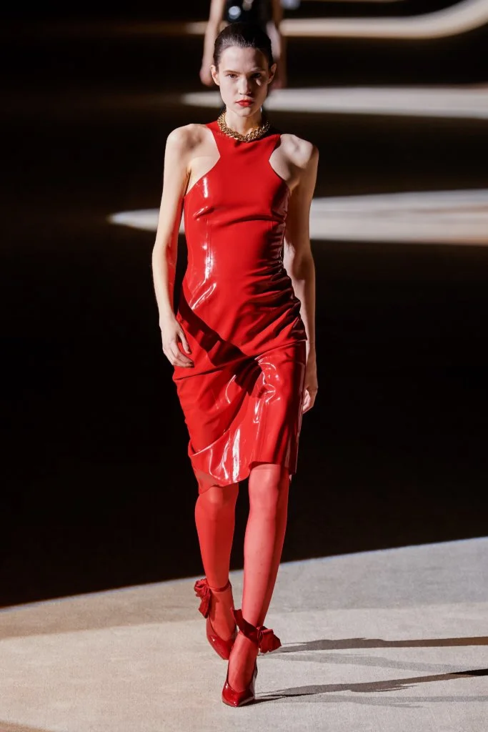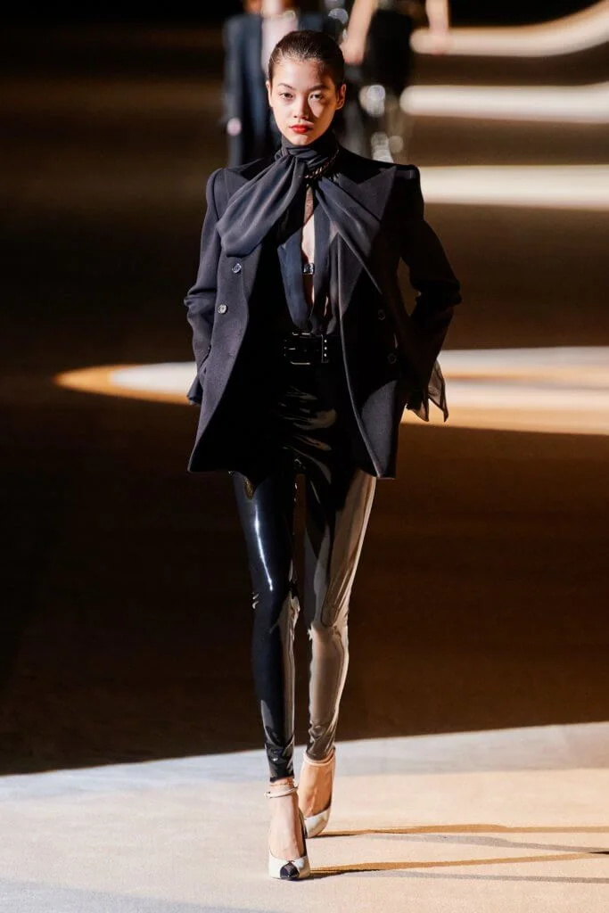 另一邊廂,Anthony Vaccarello為了找到「力與柔」的平衡點,加入如格紋、蝴蝶結、波點等優雅元素,又以硬朗的墊肩混搭著蕾絲胸圍上衣,在乳膠漆皮光影的折射下,卻有一種揉合了剛柔的衝突美感,如同當代女性有著強勢形象,而不失浪漫本性的特點。