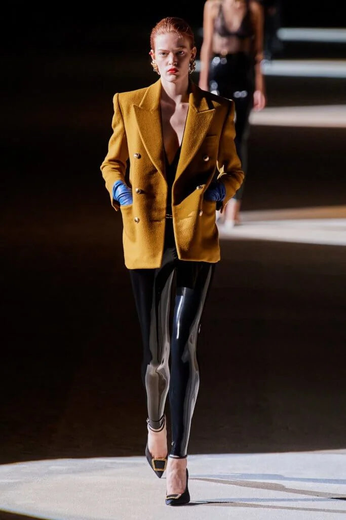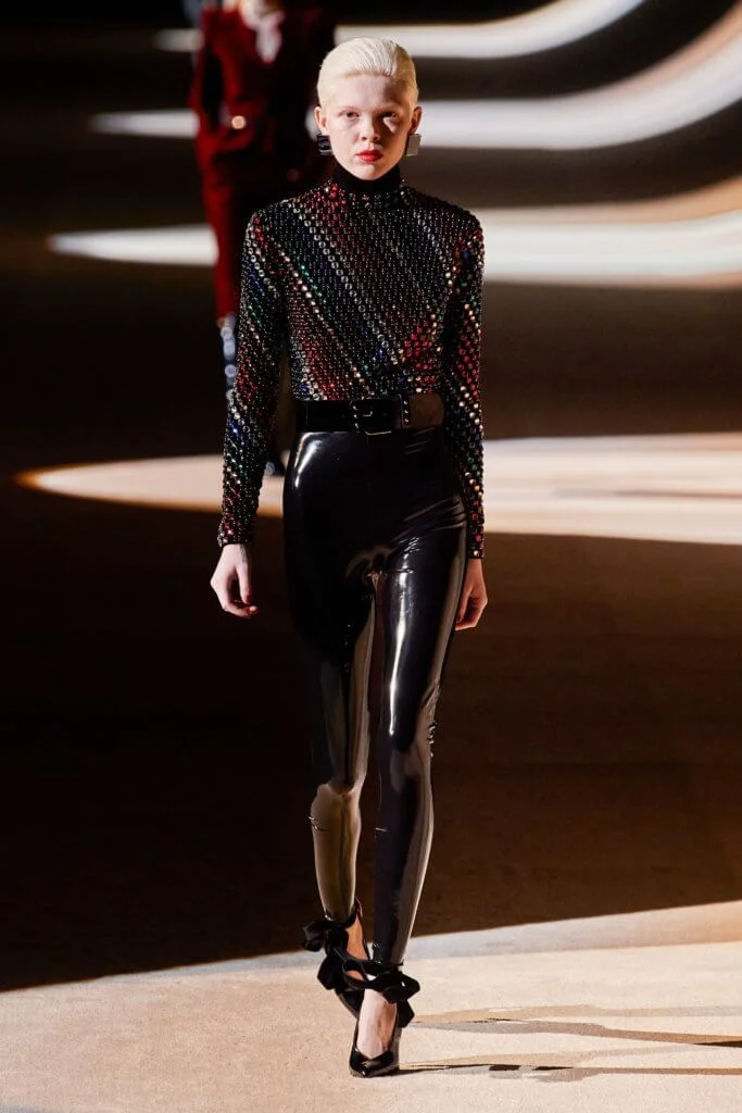 「我想找到抑制與放縱之間的平衡,紀律與愉悅之間的張力,這些元素定義了Saint Laurent的現代性。對Saint Laurent而言,優雅是不可或缺的,但同時也充滿乖僻與任性。 無彼便無此,缺乏其一,只會是普通資產階級的奢靡與庸俗。」創意總監Anthony Vaccarello說道。故是次Saint Laurent 2020秋冬系列,一改過往的暗黑色調,秉承Yves Saint Laurent先生本人一生對色彩的熱愛,強烈色彩鋪陳開來,借來戀物癖的乳膠、漆皮面料作為設計語言。成為本季重頭戲的乳膠面料,設計師深明其獨一無二的特性,它貼身得如同在女性身體塗上一層漆,能夠勾勒女士妙曼身形,也正正符合著設計師想尋找的危險、挑戰性的性感。