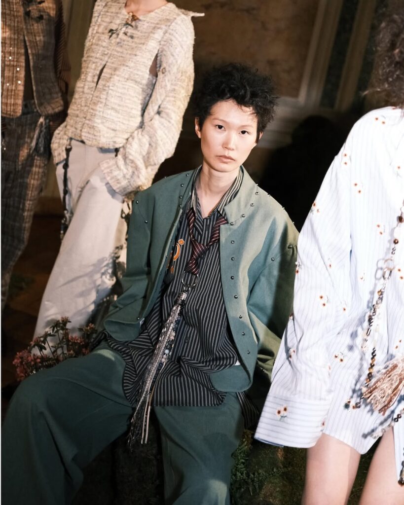 Demo:今次發布會場地Académie d’ Architecture,空間本身具有歷史感與建築秩序,因此我們刻意在這種結構之中,加入「自然入侵」的概念。場景設計以室內小型自然地景為主軸,構建起高低起伏的小山丘與草叢,讓模特兒與觀眾之間的界線被模糊。觀眾不再只是觀看者,而是被包圍於同一個空間與氛圍之中。