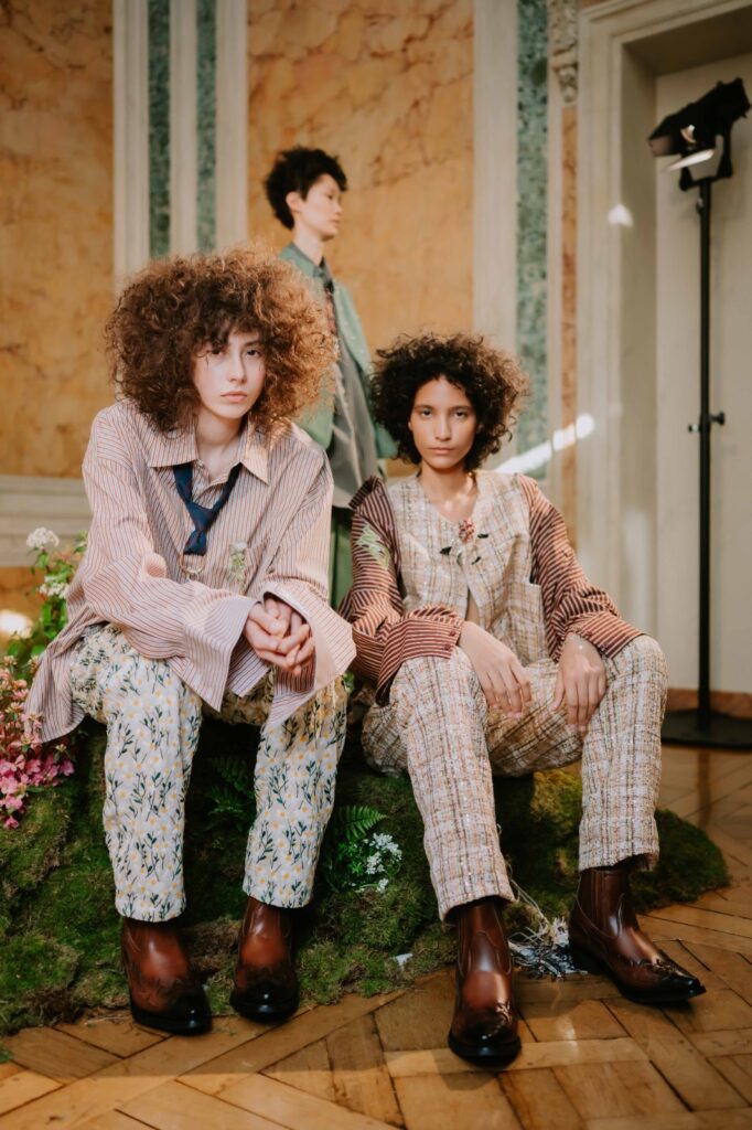 我們今季並非單純追求復古,而是提出一個問題,如果hippies活在二◯二六年,他們會是甚麼模樣呢?於是我們構想出Tailoring Hippies的概念,將Demo一貫的結構剪裁、立體輪廓與精緻手工,融入更柔軟流動的線條與花卉元素,把原本象徵反叛的文化轉化為一種溫柔而堅定的力量。性別界線被模糊,剛與柔共存,傳統與當代對話—這是屬於二◯二六年的hippies。