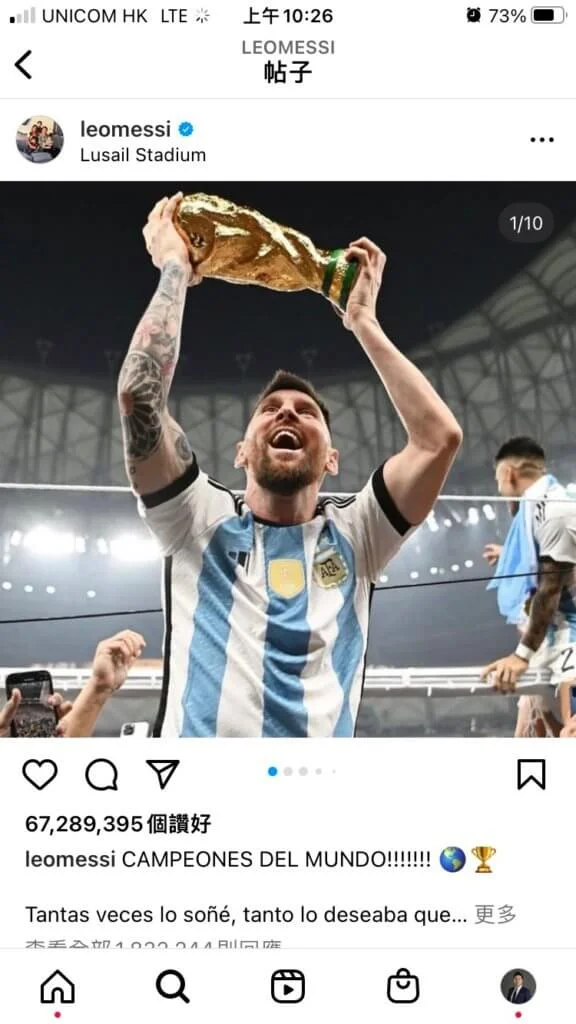 美斯(Lionel Messi) 當然係全球焦點,美斯賽後一個IG POST已破史上最多Like 紀錄,獲7000萬個Like,IG Likes 亦正式封王!之前的最高紀錄是一隻蛋(黑人問號?!),然而IG 最高follower 仍是美斯的對手 C 朗(Cristiano Ronaldo),以5.2億Followers 為全球Fans 之王!2022年全球IG 有14億個Accounts, 即每2.7個IG Account 便有一個是Follow 緊C 朗的。