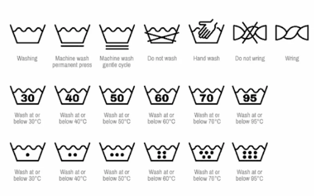 洗衣盆代表可水洗,常見數值有30℃、40℃、50℃等。洗衣盆內帶手掌圖案表示僅能手洗,盆內波浪線搭配橫線,一條橫線代表溫和處理、兩條橫線代表非常溫和處理(降低機洗轉速)。整個圖標加交叉則表示不可水洗。部分地區標籤會用圓點替代數字,圓點數愈多溫度愈高(1點≤30℃、2點≤40℃,如此類推)。