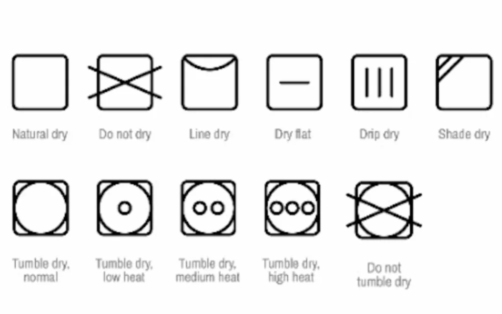基礎方框代表可晾乾,方框內細節區分方式:下垂彎線=懸掛繩子上晾乾、三條直線=滴乾、橫線=平放晾乾,方框左上角加斜線表示需陰涼處自然乾燥。方框內有圓圈代表可以用烘乾機烘乾,中間的點數代表指定溫度,點數愈高代表溫度愈高。