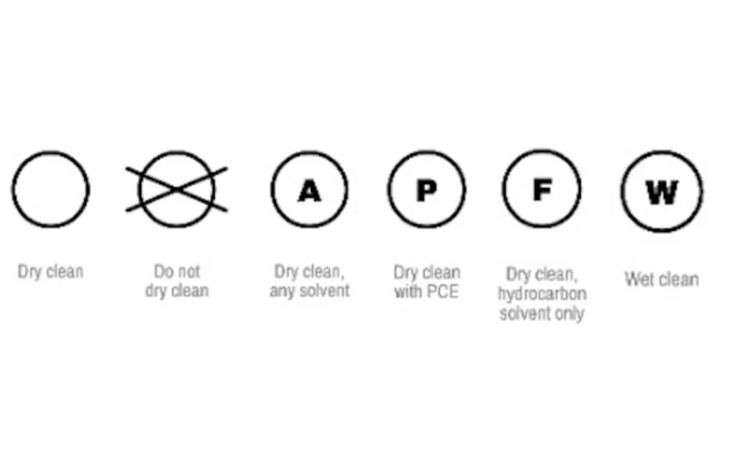空心圓形代表可專業乾洗,加交叉表示不可乾洗。圓內字母區分溶劑類型:「A」=可用任何溶劑、「P」=僅用氟化炭或石油溶劑、「F」=特定溶劑(如飛機燃料、純酒精等)、「W」=專業濕洗。