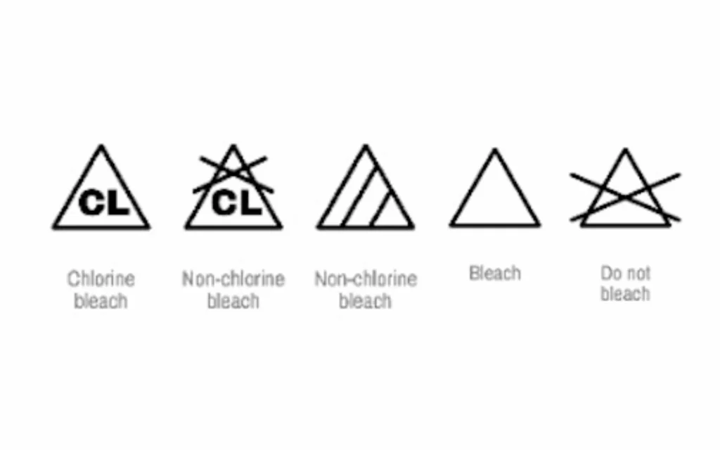 空心三角形代表可漂白,三角形內標註「CL」表示可用含氯漂白劑,三角形加兩條斜線代表只能使用氧漂,不能氯漂。三角形加交叉表示不可使用任何漂白劑,僅有空心三角形未加標註時,可使用冷卻的稀釋漂白劑溶液。