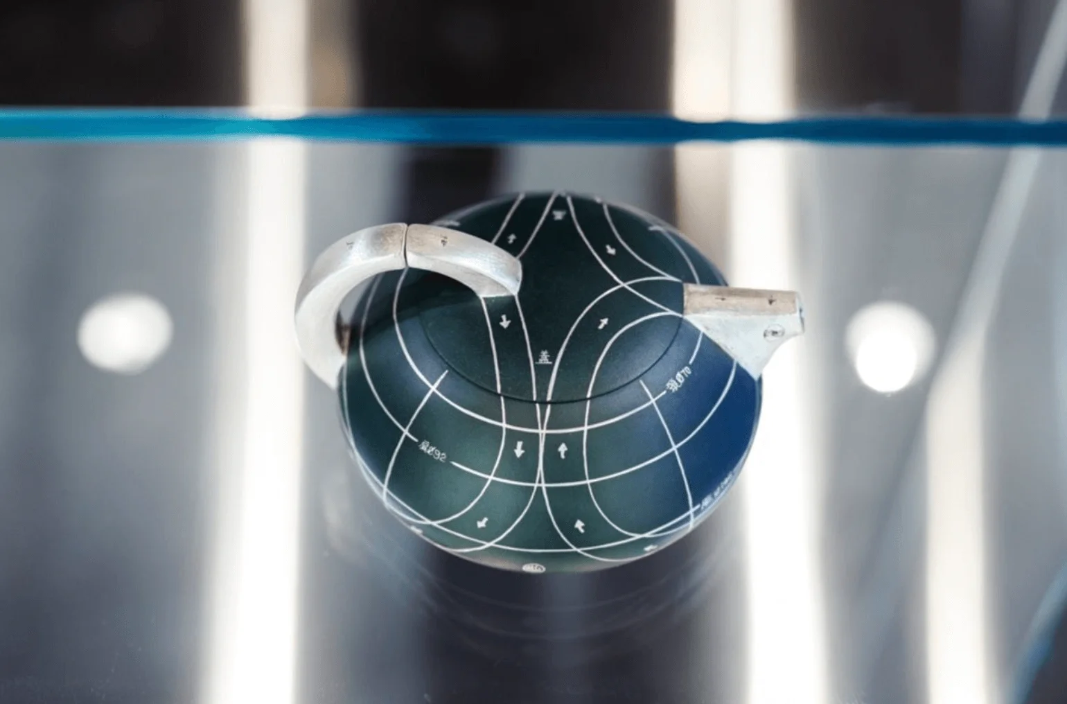 王令塵《東西》的第一件作品帶來了「茶壺」,茶壺在中國寓意著文化,象徵著敬重和尊敬,是東方文明的象徵。該作品採用了具有與黃金相當價值的墨綠泥係由黏土手作而成,以傳統工藝勾勒銀色網格狀藍圖,並將其放置於具現代環境特色的現代主義茶室,呈現歷史與現代的融合。