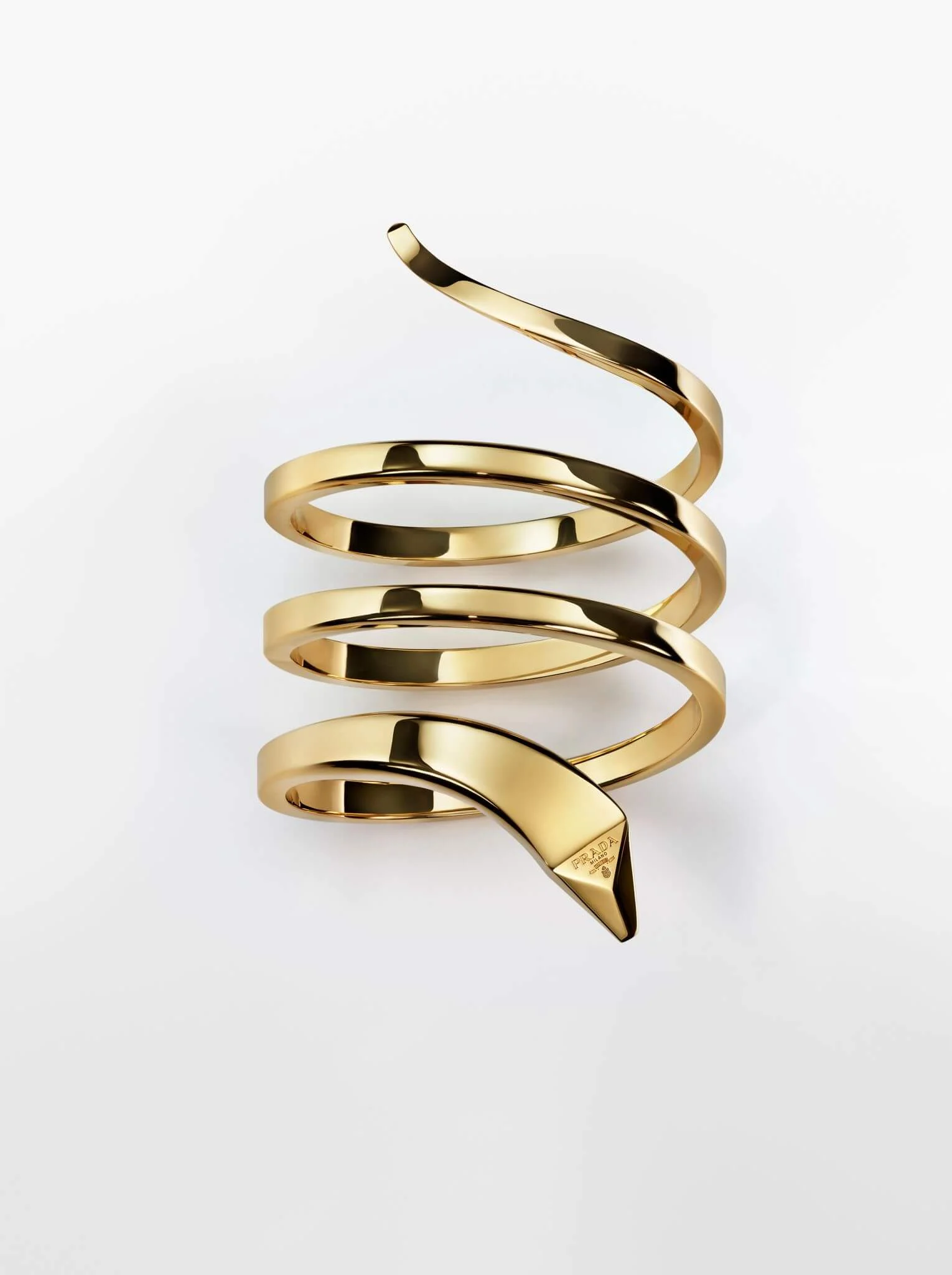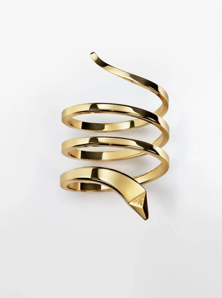 Prada 的ETERNAL GOLD高級珠寶系列是國際奢侈品牌業界中首個以100% 獲認證的回收黃金打造的高級珠寶系列,蛇形手鐲、心形圖案、鏈帶項鍊及緞帶頸圈等設計塑造高級珠寶的廓形,象徵着愛和情感的符號。