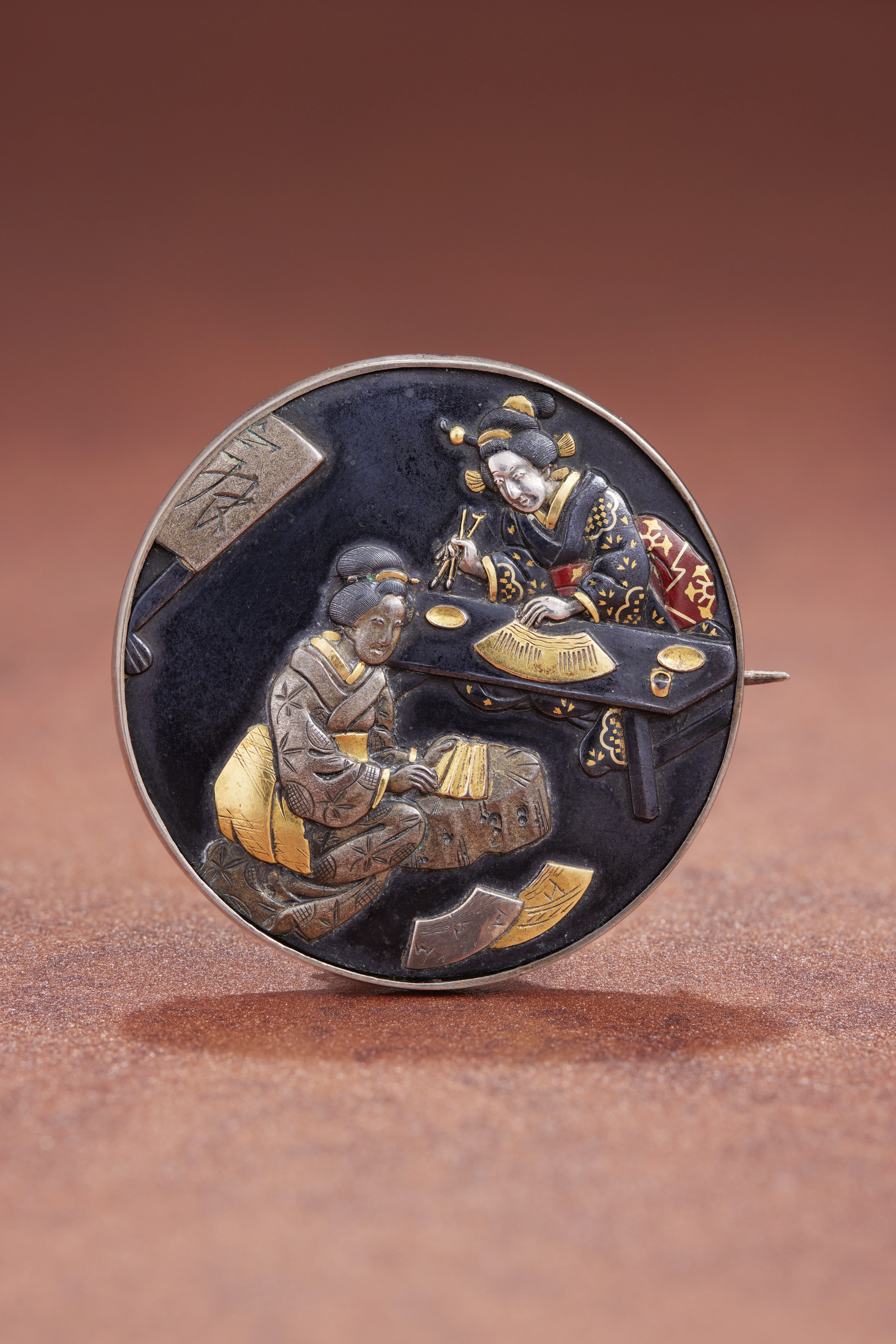 展覽特別展出三十六件以赤銅為核心材料的西方珠寶作品,這些珠寶將日本工匠的精湛技藝與歐洲美學融為一體,描繪出江戶時代的生活情景:悠閒的茶會、漁船上的漁夫、風中搖曳的蘆葦,以及彈琴的優雅女子─ 每一處細節都在微縮空間中栩栩如生。更令人着迷的是這些珠寶背後的故事:一八六七年巴黎世界博覽會上,日本工藝技術首次在全球舞台上大放異彩,深深吸引了西方珠寶商。在隨後的二十年間,赤銅技術進一步融入歐洲設計語言,呈現出東西方文化交匯的絕美成果。展覽還補充了十九世紀末「日本主義」浪潮的藝術作品,包括海報與設計草圖,展示出當時西方對日本文化的熱烈追捧。這些藏品首次公開亮相,無疑是對珠寶歷史與文化的一次深刻致敬。