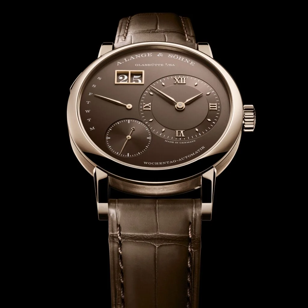 ⾸次推出的750蜂蜜⾦Honeygold錶殼,是朗格錶廠獨有的合⾦材質,與⽤上棕⾊925銀製作的錶盤交相輝映,配搭着褐灰⾊鱷⿂⽪錶帶,交織出柔和的⾊彩組合,營造了獨特的優雅魅⼒。除了亮麗的⾊彩組合,錶殼亦盡顯比例線條和比例的美感。直徑僅39.5毫⽶、厚 10.4 毫⽶的設計能夠令腕錶舒適地貼合⼿腕。⽽錶耳和錶圈亦經過精⼼調整,為腕錶增添多⼀重的輕盈氣息。