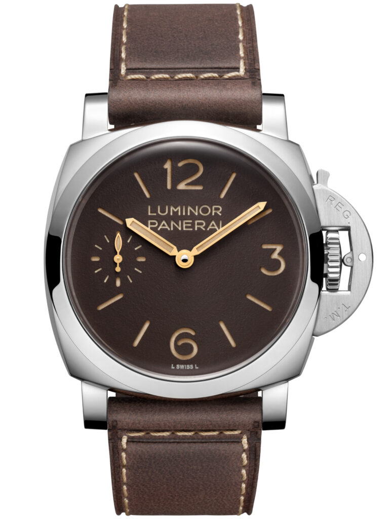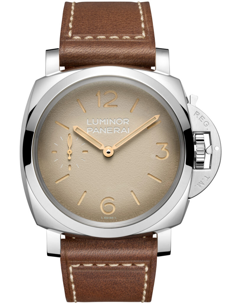 Luminor 八日動力儲存腕錶PAM01733向品牌一九六〇年代原版四十七毫米的Luminor設計致敬,並調整至四十四毫米錶殼。這款新作完整保留了Luminor堅固錶殼、標誌性錶冠護橋、夜光數字與獨特三文治錶盤結構的鮮明設計特徵,配上Brunito的造舊處理,呈現出獨特風格。