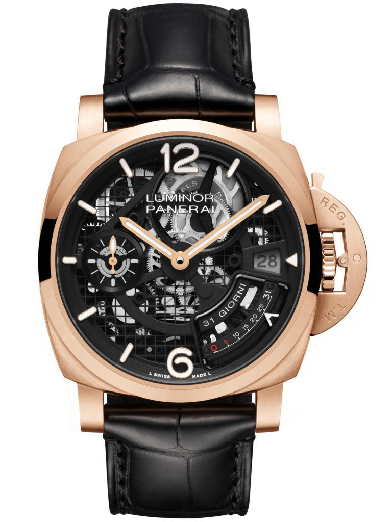 外觀方面,PAM01631腕錶以四十四毫米Panerai Goldtech™錶殼承載Luminor系列的經典設計,由金與銅製成的基底加入了少量鉑金及銀,令錶殼呈現獨特的紅潤色調。鏤空結構亦為機芯帶來多維視角,透過透明藍寶石水晶底蓋,可欣賞外露發條盒與製作工藝的技術美感。品牌專利的偏光日期盤僅可於三點視窗位置讀取,融入鏤空架構之餘又不會影響整體的通透感。而沿機芯外緣設置的弧形動力儲存顯示,可清晰直觀地呈現剩餘能量,無論上鏈或佩戴皆一目了然。