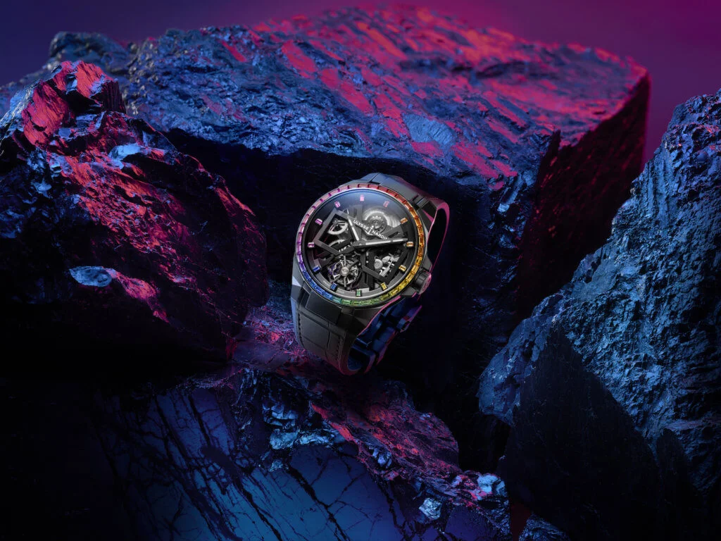 彩虹顏色的寶石以漸變的姿態整齊排列在錶圈上,是近年錶壇上大熱的設計,Ulysse Nardin於Geneva Watch Days推出的三款新作亦帶錶迷們躍入霓虹之境,設計靈感源自二○○一年在擒縱裝置中加入的矽晶片所折射出來的彩虹光澤。限量五十枚的Blast陀飛輪腕錶,錶徑為45毫米,錶圈和時標鑲嵌五十顆長階梯形切割紅寶石和藍寶石,而「X」形框架在鏤空錶盤上構成複雜的幾何結構,鉑金自動盤位在十二點鐘位置,搭載Ulysse Nardin自製UN-172自動上鏈鏤空機芯,採用矽技術打造,配備矽質擒縱機構及擺輪游絲,動力七十二小時。中層錶殼以黑色DLC鍍層鈦金屬打造,上層錶殼為黑色陶瓷材質,經過拋光與噴砂處理,搭配天鵝絨質感的黑色橡膠錶帶,配以黑色DLC鍍層鈦金屬和黑色陶瓷錶釦,前衛設計徹底顛覆傳統製錶規範。