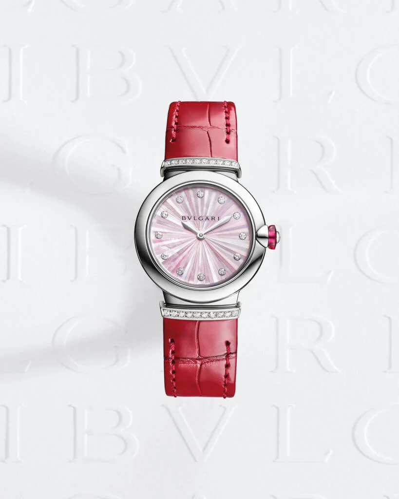 Lvcea 是品牌經典的日常圓形腕錶,歷代設計均以日晷為靈感,致敬古羅馬以光線計時的傳統。2022 年新一代使用全新配色,以特殊材質和立體結構捕捉光線,呈現更絢麗的視覺效果。運用精湛的古典意大利工藝—嵌花(Intarsio)細工鑲嵌拼貼出珍珠母貝錶盤,三十七片微小的珍珠母貝與藍色砂金石經過手工切割與刻面,接著依照規則的幾何形狀精準組合,塑造錶面的立體效果,璀璨光芒正如永恆之城的天空般令人沉醉。