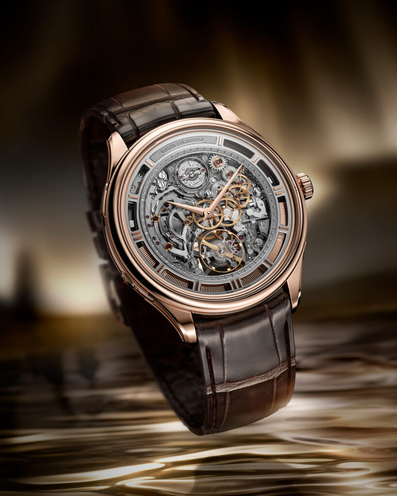 積家推出複雜功能超薄三問報時陀飛輪腕錶,41.4mm的18K玫瑰金錶殼厚度僅為8.25mm,搭載於2014年推出、獲六項專利的362型機芯,此機芯至今仍是世上最纖薄的自動上鏈三問報時陀飛輪機芯。為了展現機芯,傳統上會採用鏤空設計,即在機芯現有的錶橋上切出開口。然而因為機芯運作必需的錶橋和夾板結構部件仍會阻擋部分機芯,所以無法展現機芯全貌,積家想到的解釋方法,就是索性令錶橋也變透明,三個錶橋以透明藍寶石水晶製成,而直接在機芯內安裝藍寶石錶橋也需要不少工夫,尤其要精確鑲嵌不可或缺的11顆紅寶石軸承。由於直接將紅寶石鑲嵌到藍寶石上並不 可行,因此積家採用18K玫瑰金,不但巧妙地解決難題,更提昇了機芯的美感,視覺效果通透純淨,盡展593枚機芯部件的精密美態。