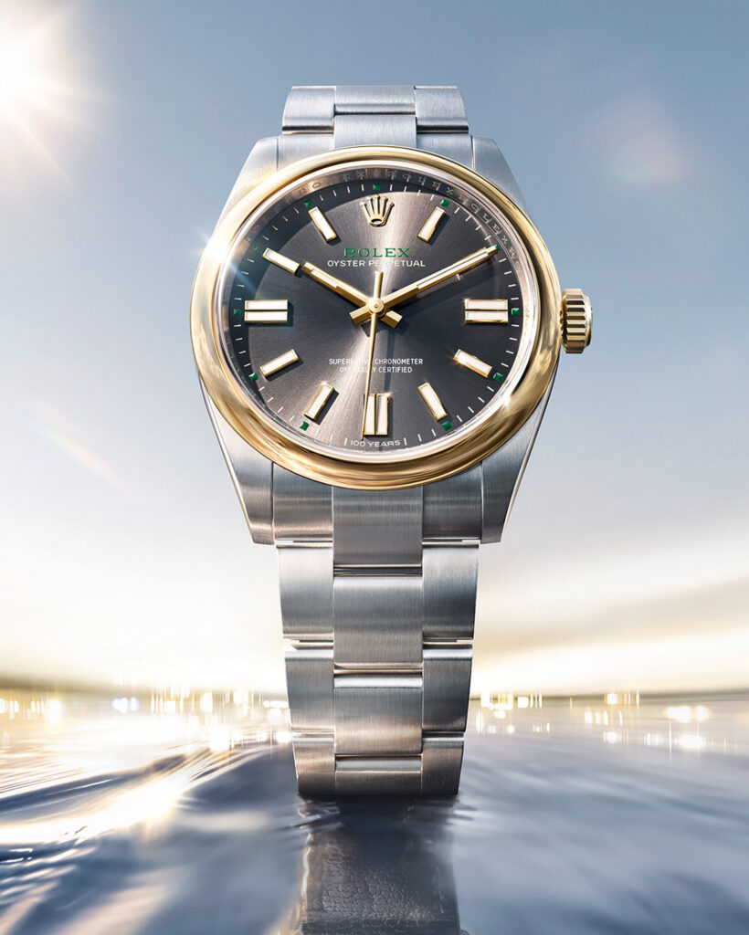 為慶祝蠔式錶殼100周年,Rolax官方早在Watches and Wonders 錶展前數天公開不少新錶細節,作品如今終於開估。作為話題之作,新推出的Oyster Perpetual 41(蠔式恒動型 41)黃金鋼款腕錶,重新詮釋黃金與蠔式鋼相結合的獨特美學風格,外圈及上鍊錶冠以黃金鑄造。蠔式錶帶的中間鏈節通以往常由黃金鑄造,此次則與外側鏈節及中層錶殼相同,均採用蠔式鋼材質。時計上鍊錶冠鐫刻浮雕數字「100」,新款石板灰色錶面上,6點鐘位置則鐫刻了「100 YEARS」字樣,取代了傳統的「SWISS MADE」標誌。此外,分鐘軌道上,五分鐘間隔刻度均以綠色方格標示;而「ROLEX」字樣亦採用相同的綠色,以移印工藝呈現,彰顯勞力士經典色彩的別樣風采。