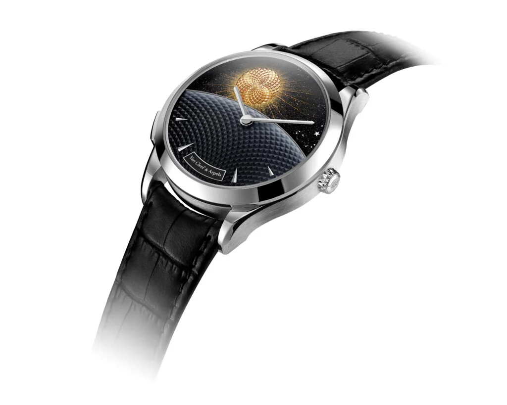 如果月亮代表我的心,那麼Van Cleef & Arpels的新作就可以隨時敞開心扉。繼2024年後,品牌再次為2008年面世的Jour Nuit系列加入新成員,向歷來勾起世家浮想聯翩的明月致敬;腕錶同時搭載兩枚交疊的複雜功能機芯:一枚驅動同名的Jour/Nuit日/夜顯示;另一枚「天象」複雜功能機芯則實時捕捉月相。42mm白K金Midnight錶殼內藏閃爍錶盤,綻放黑色穆拉諾砂金玻璃夜空上的璀璨星光。在日間,刻上璣鏤飾紋的金質太陽劃過天幕,隨著夕陽西沉,一輪白色珍珠母貝皎月就在這方寸天地中冉冉上升,圍攏在旁的丙烯酸纖維星光烘托其銀白清輝,兩顆星體在地平線上互相追逐。日與月交替的舞步,配合每29.5天成一循環的月相週期上演,即使月亮隱沒於地平線下,只需輕按錶圈上的按鈕,即可重溫皎月清輝。
