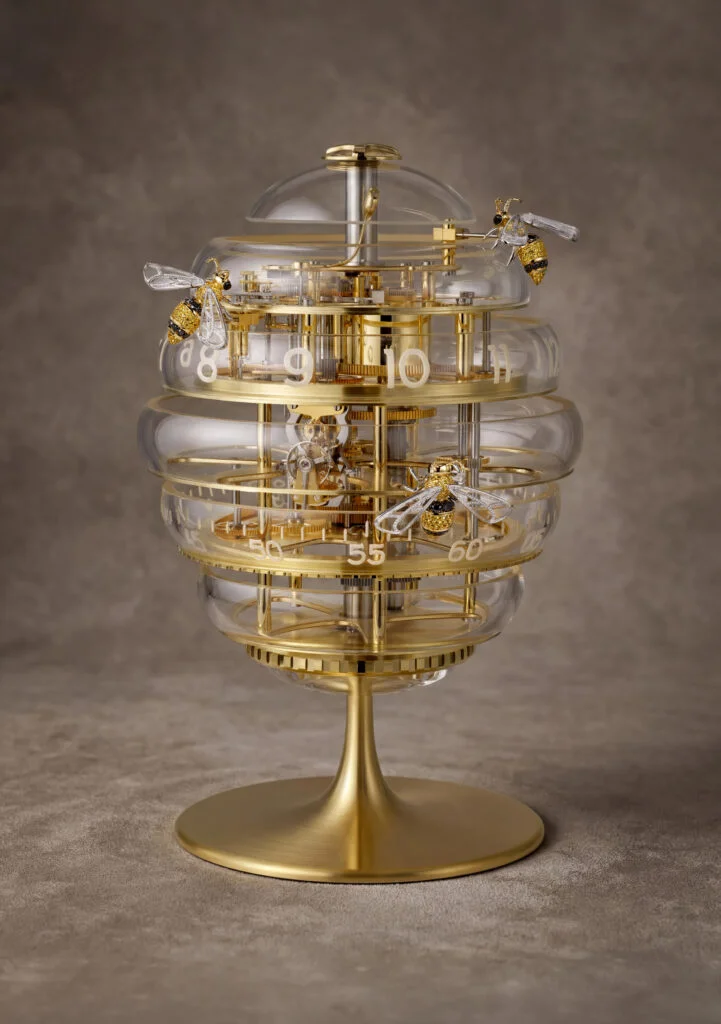 蜂巢座鐘由蕭邦錶廠構思,並與L’Épée 1839攜手打造。由七層圓潤的玻璃環疊加而成的座鐘,內部包裹著配有多枚橋板的機械機芯,底部由堅固的鍍鋅鋼底座支撐。為保持玻璃外環表面的純淨度,小時與分鐘刻度均雕刻於內側,並以霧面處理確保最佳的讀時清晰度。座鐘外部點綴的三隻蜜蜂象徵Scheufele家族的三代傳承,由品牌位於日內瓦的高級珠寶工坊手工精製,以18K黃金打造,並鑲嵌黃色藍寶石與黑鑽石形成身上的條紋,再以黑色尖晶石點綴雙眼,至於翅膀則以晶瑩剔透的白水晶雕刻而成。別以為蜜蜂只是裝飾,其實還具備實際功能!其中兩隻蜜蜂的位置經過精心設計,尾針可作為精準指針,指向旋轉玻璃環上的小時與分鐘刻度。第三隻蜜蜂則於座鐘頂部附近,頭部指向由選擇器設定的報時模式。