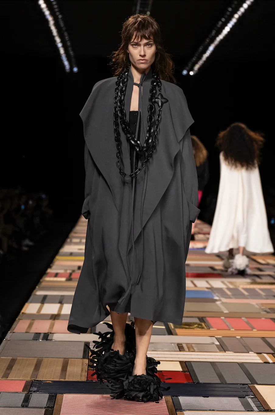 Louis Vuitton今季以多個行李箱推疊成一個T台,女裝創意總監Nicolas Ghesquière以此向品牌的起源致敬,系列剪裁富有柔軟質感與頑固的輕盈,兩種看似矛盾的存在被設計師完美融合,最後品牌亦帶來與藝術家Laurent Grasso合作的設計,將其《Studies into the Past》的五幅畫作點綴部分設計。當中亦有不少有趣又實用的手袋,除了扇形手袋外,還有一大一小兩袋並用的設計。